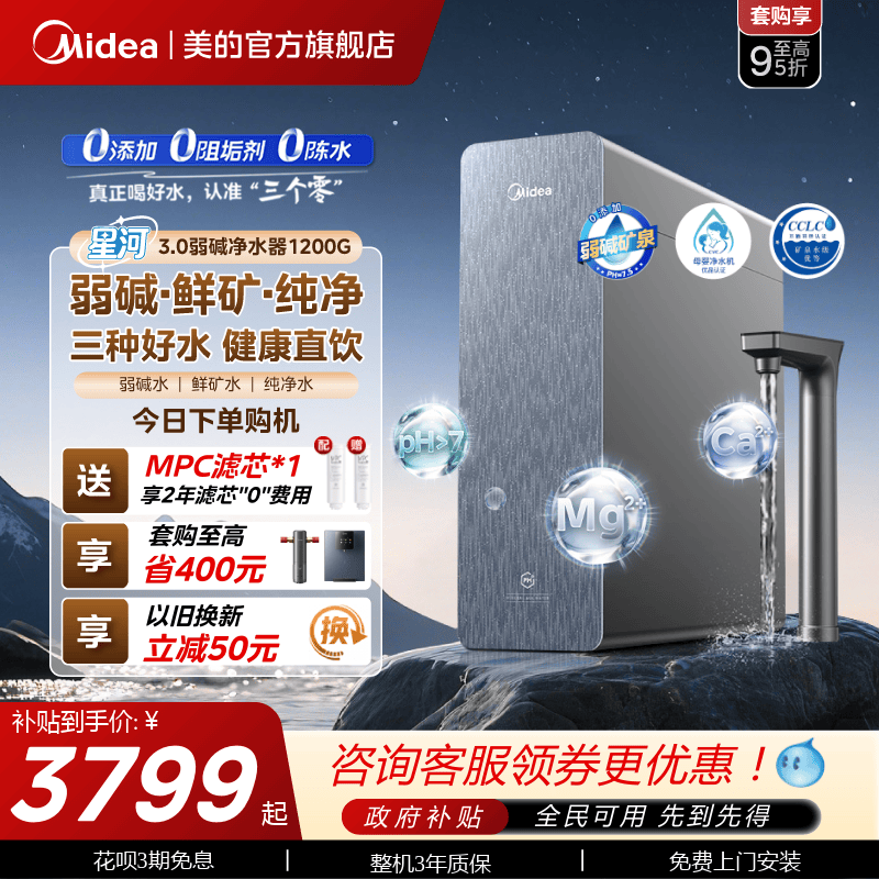 星河3.0美的弱碱净水器矿物质直饮厨下式反渗透1200G净饮水机