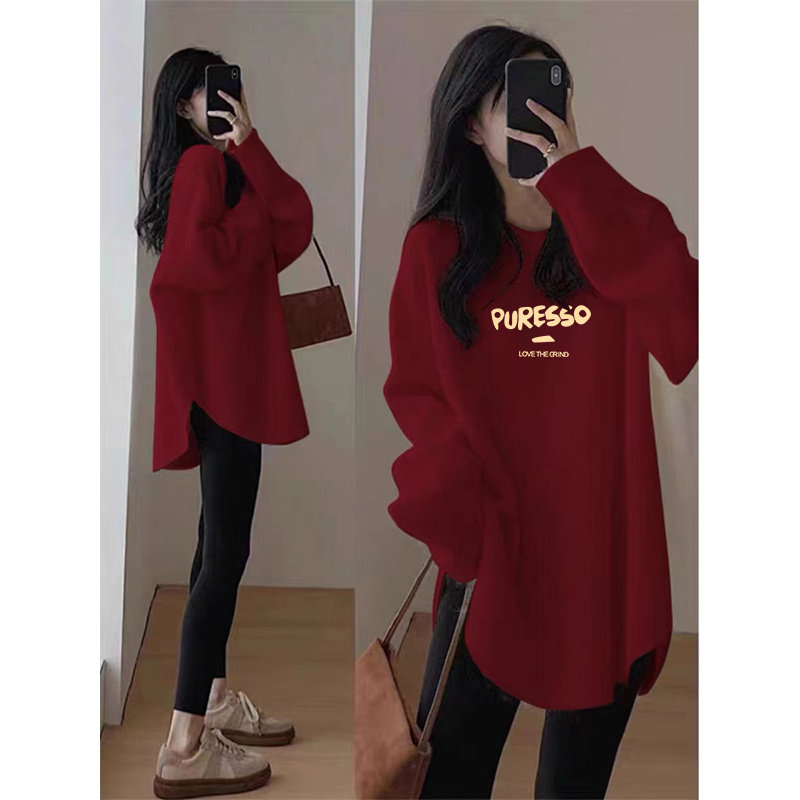 2025中长款纯色V领宽松长袖t恤女开叉纯棉打底衫磨毛内搭休闲上衣