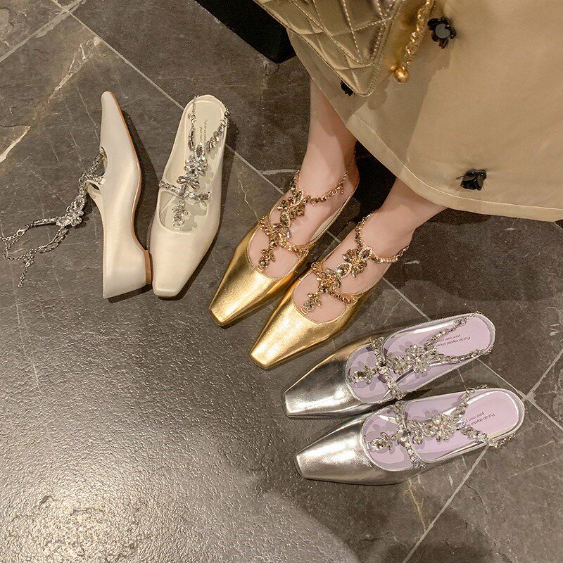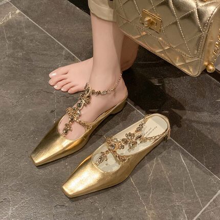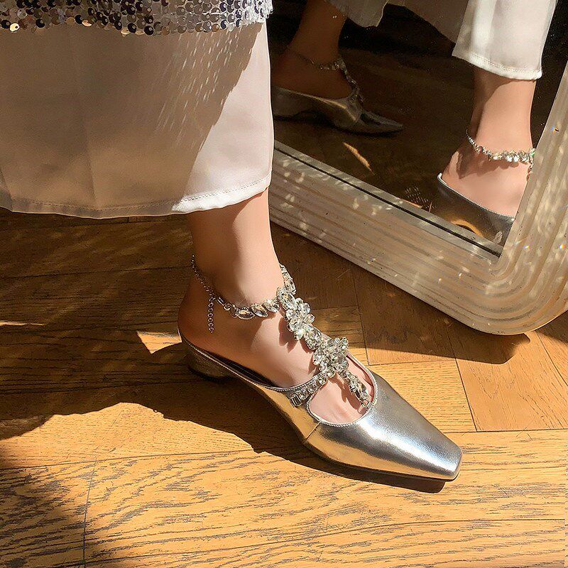 绝美小高跟鞋水钻T带真皮包头夏日半拖鞋配裙子凉鞋女款2025新款