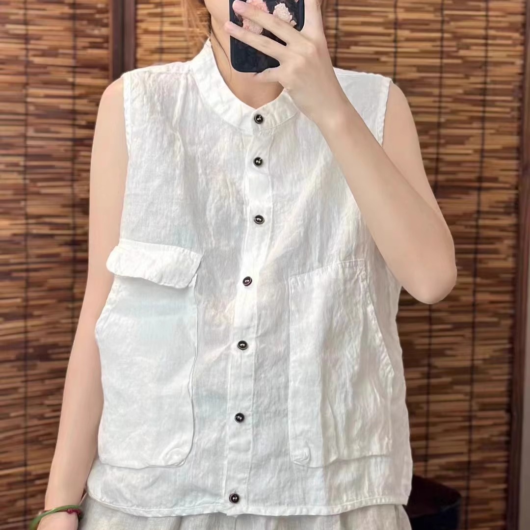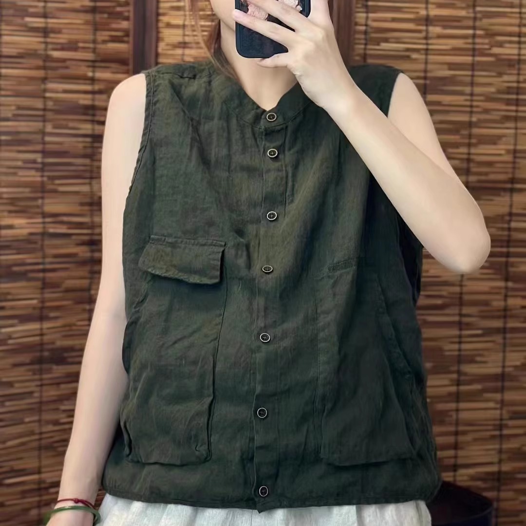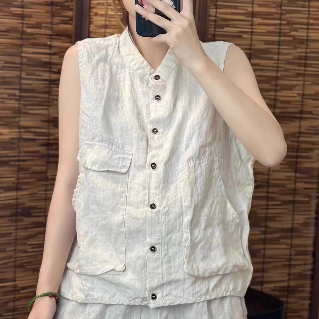 高品质纯亚麻马甲女2025夏季新款时尚大口袋宽松百搭无袖背心外穿