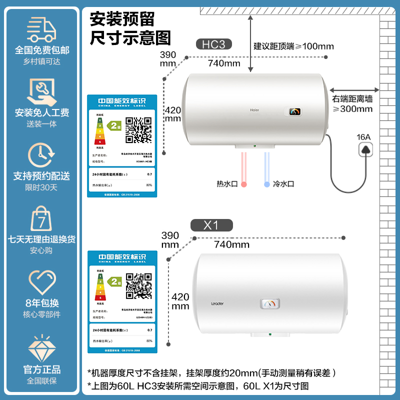 海尔电热水器以旧换新补贴官方电家用速热节能小型卫生间洗澡HC3