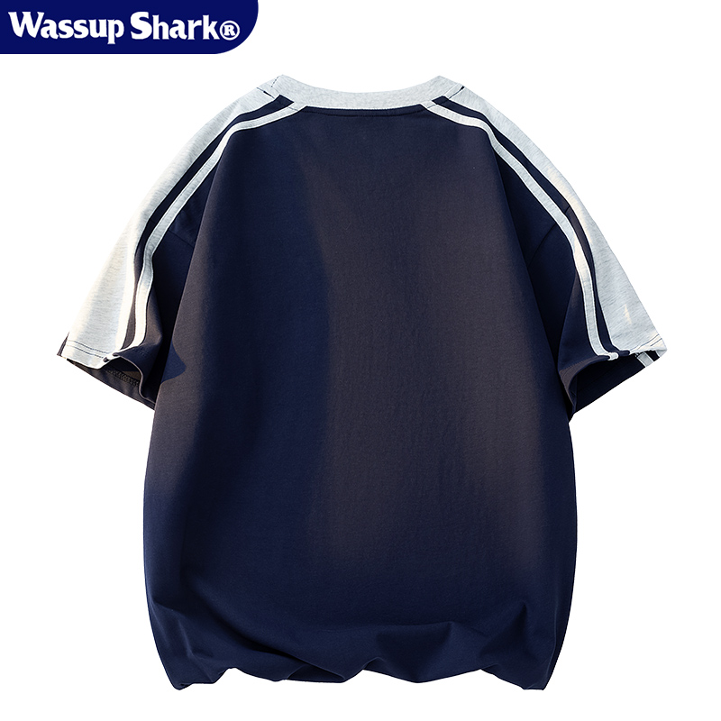 Wassup Shark纯棉插肩袖条纹短袖t恤男女夏季休闲宽松上衣体恤潮