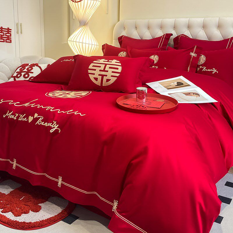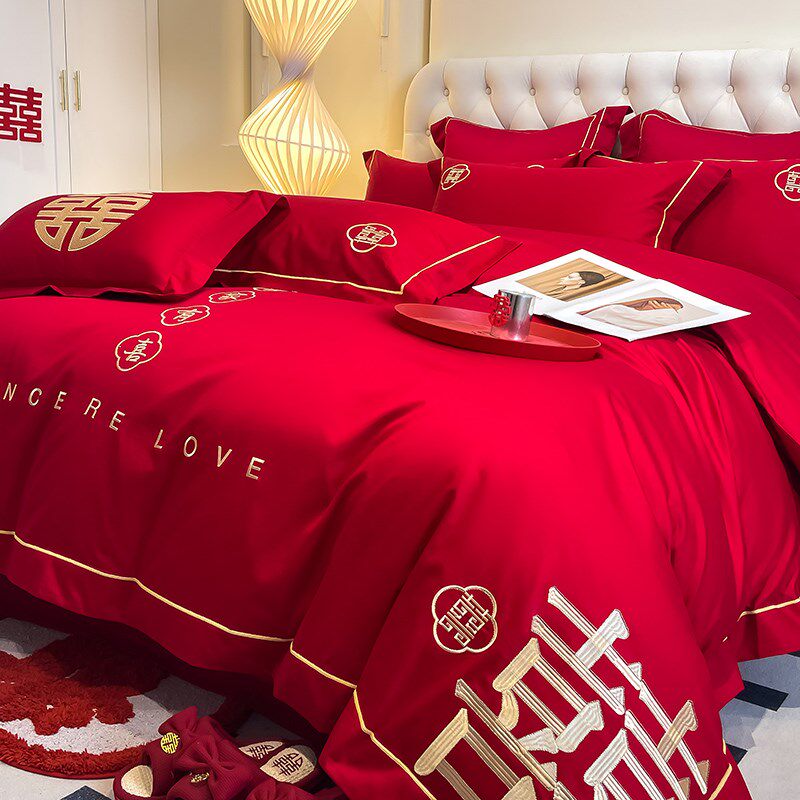高级感婚庆四件套红色结婚刺绣被套床单婚礼喜被床上用品婚嫁
