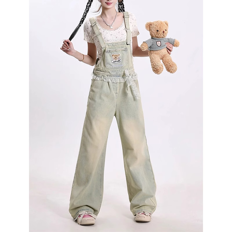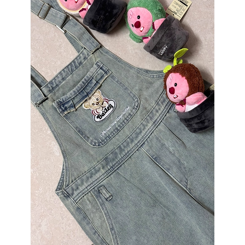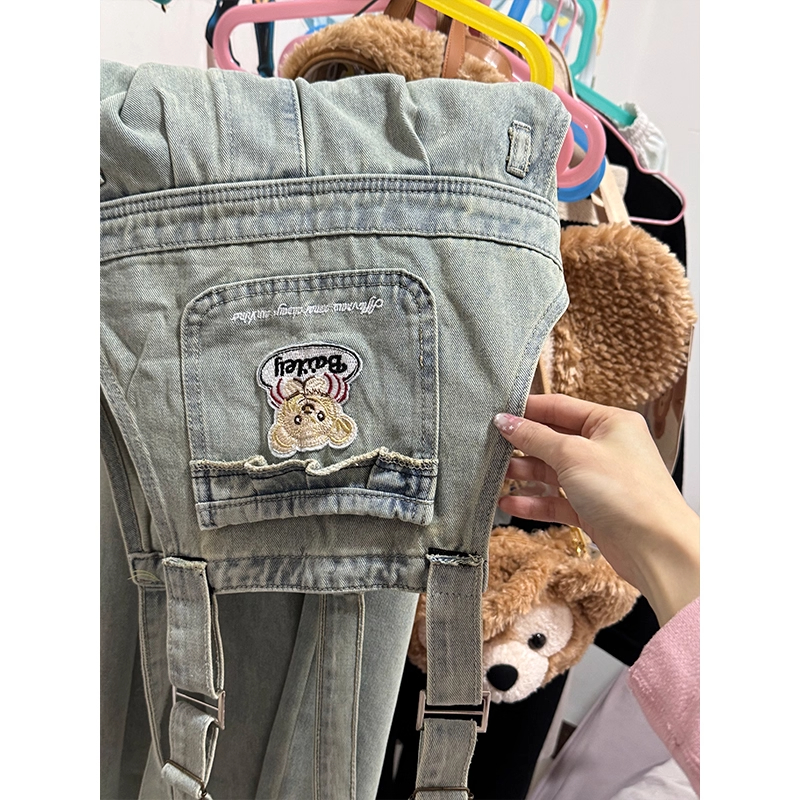 复古水洗刺绣牛仔背带裤女春秋新款可爱减龄宽松显瘦休闲连体裤子