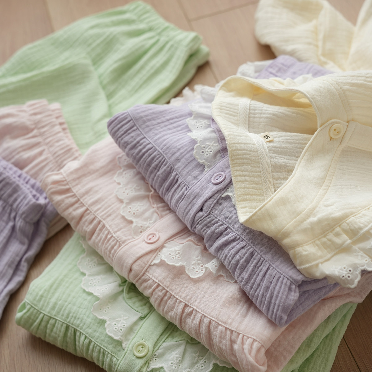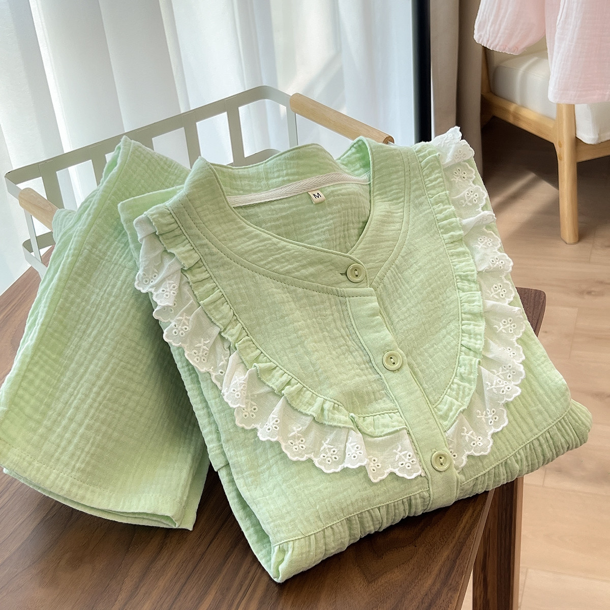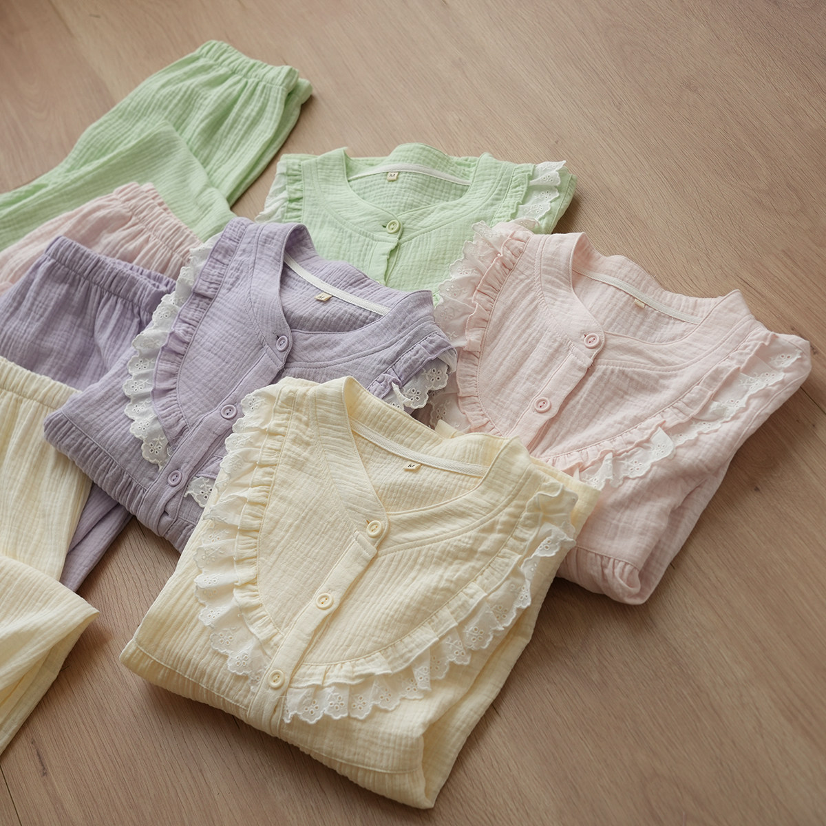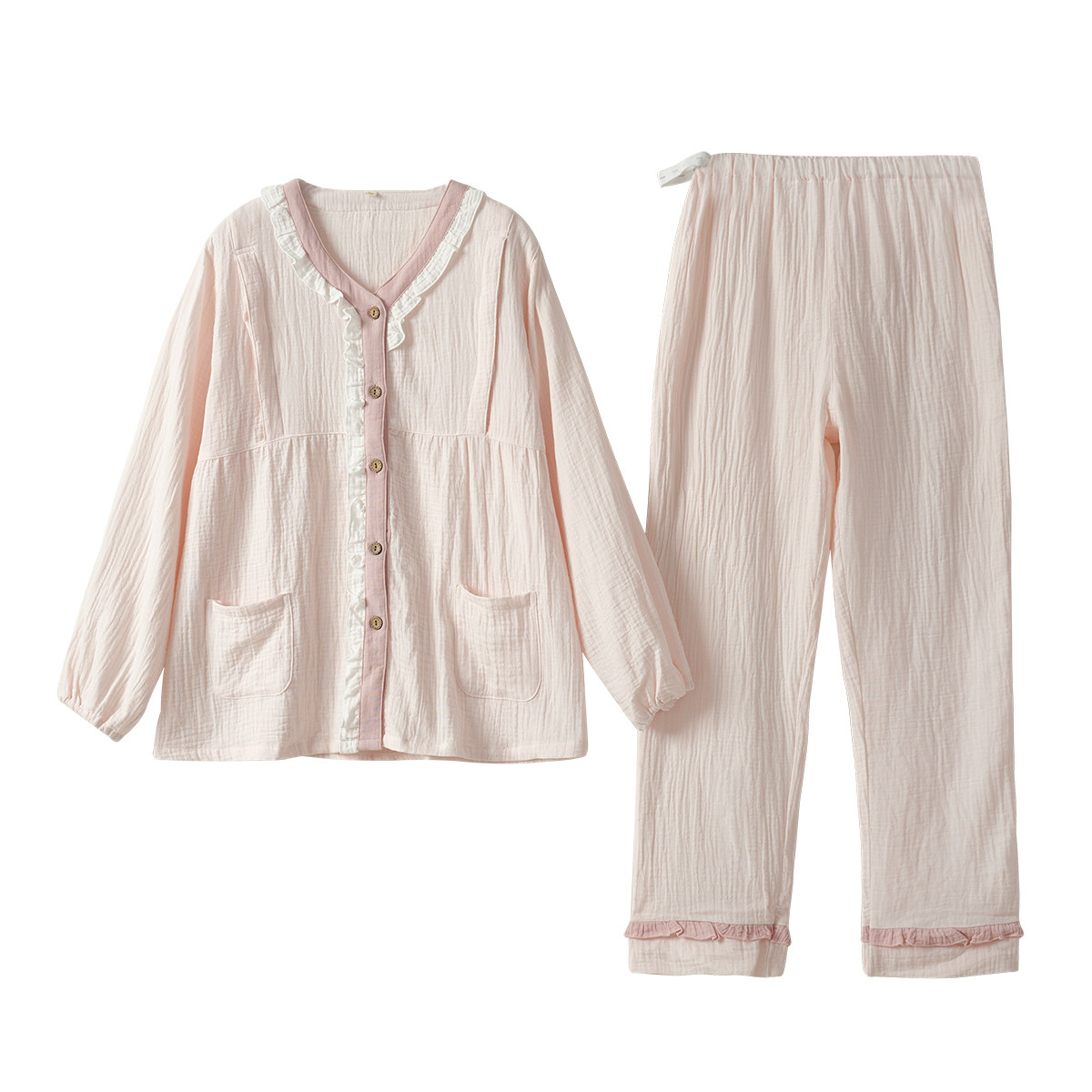 40支 双层纱布全棉女士木耳边家居服纯棉绉布长袖睡衣睡裤 春夏款
