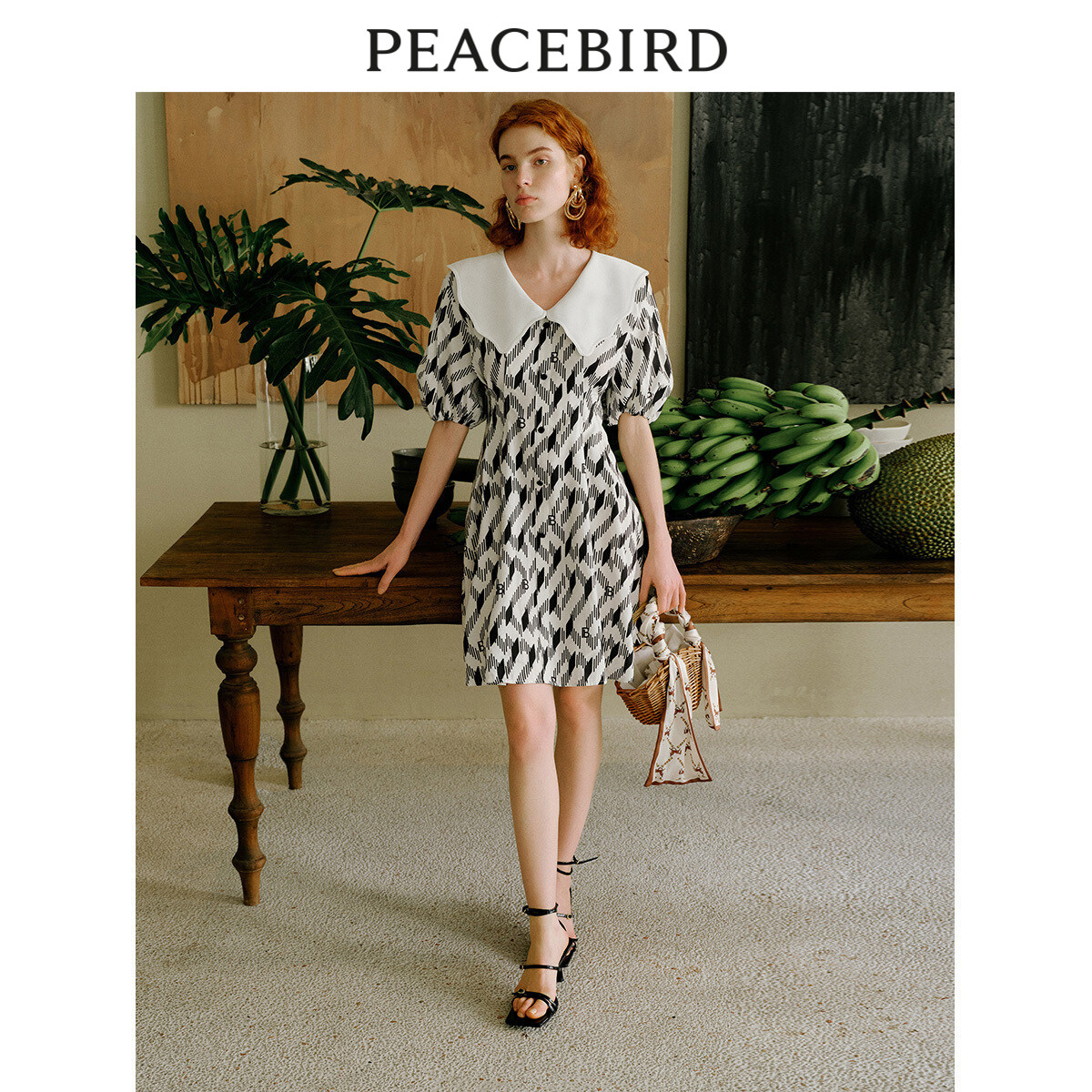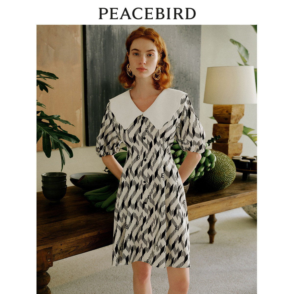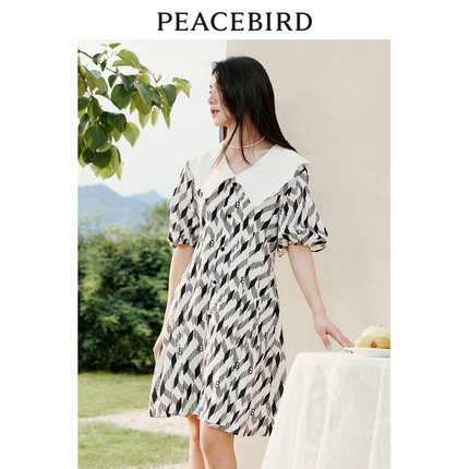 太平鸟 夏季复古满印大翻领连衣裙高腰泡泡袖裙子女士奥莱