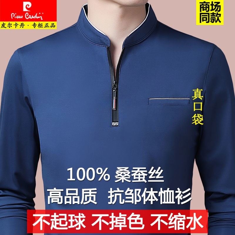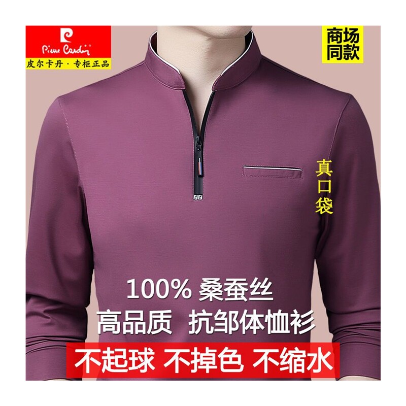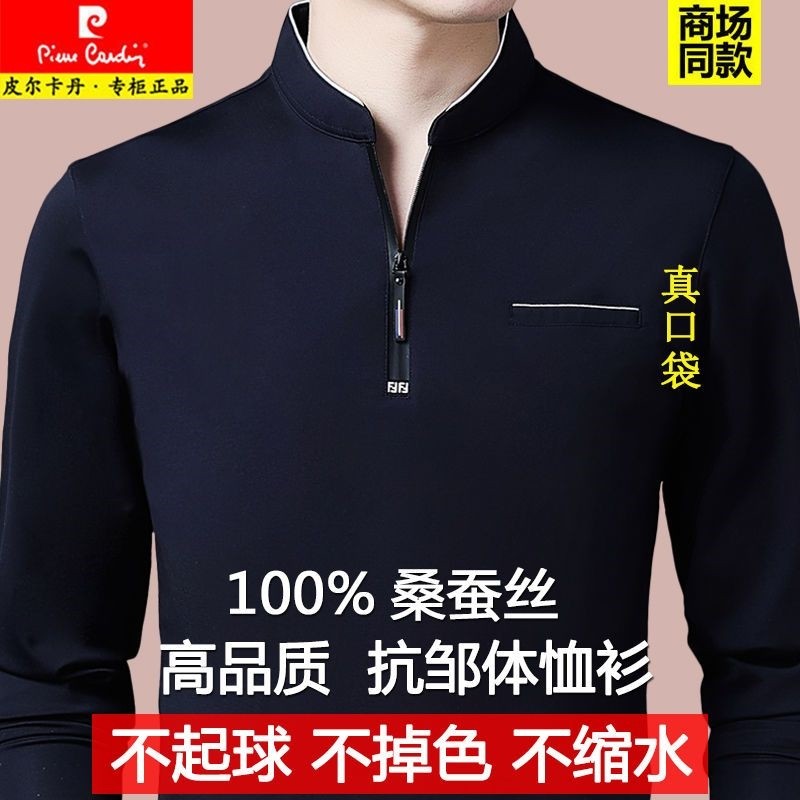 皮尔卡丹100%桑蚕丝长袖t恤男中年拉链立领体恤休闲打底衫春秋款