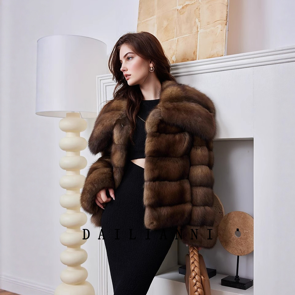 俄罗斯进口满天星紫貂时尚大翻领皮草外套女环保水貂皮毛一体大衣