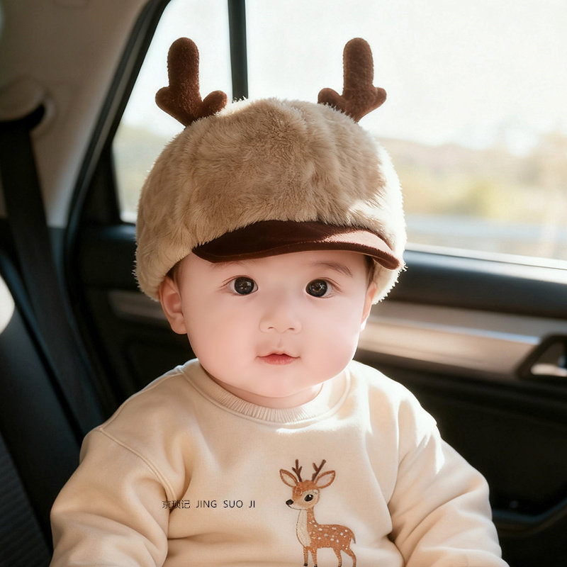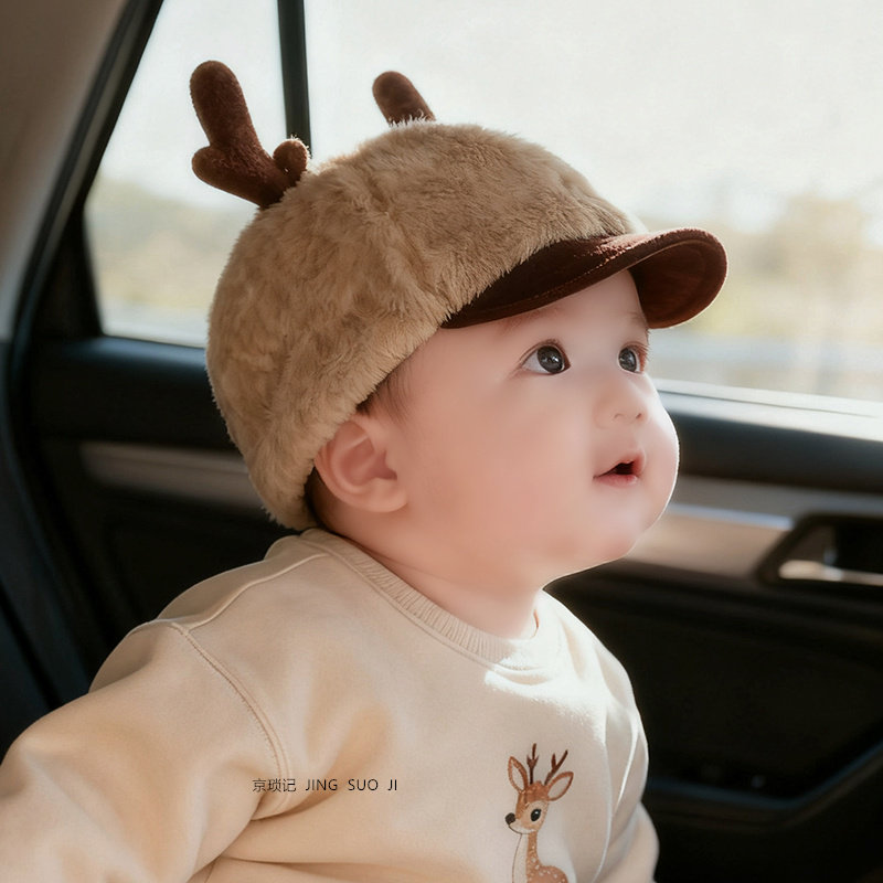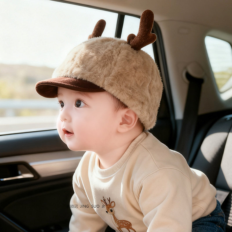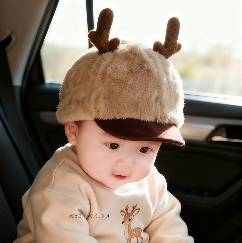宝宝帽子冬季可爱鹿角保暖毛绒鸭舌帽男女童加厚防风防寒棒球帽潮