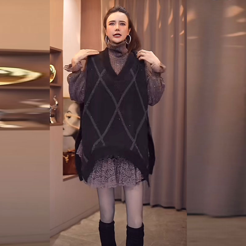时尚减龄套装女2025秋装新款蕾丝拼接高领打底衫+针织马甲两件套