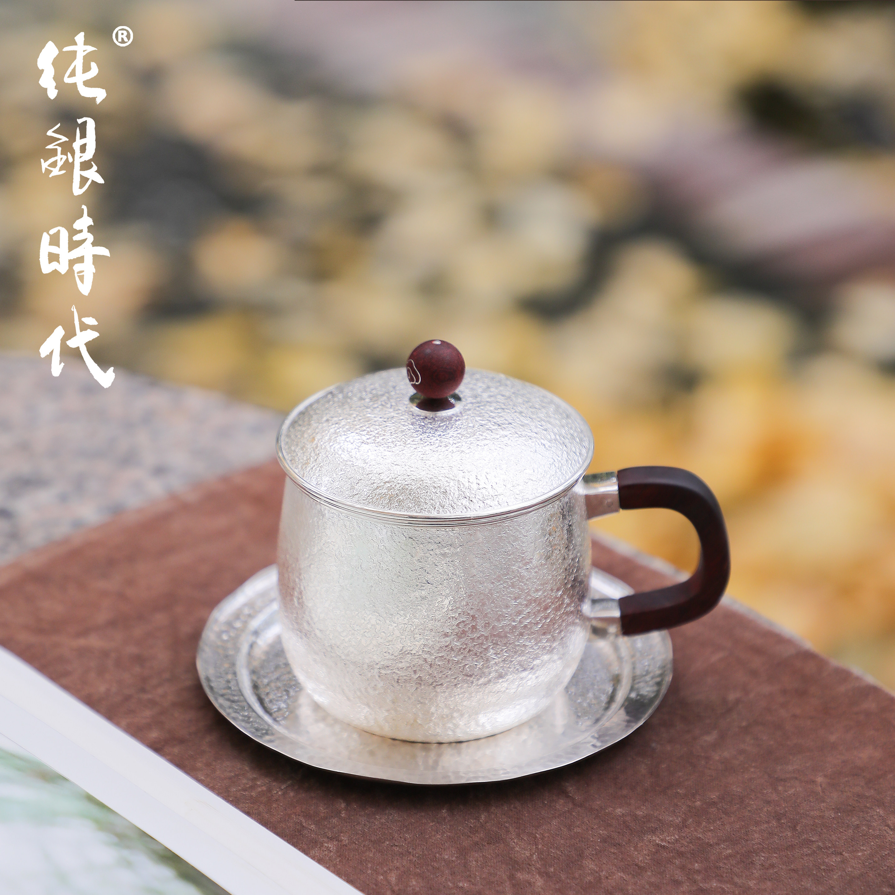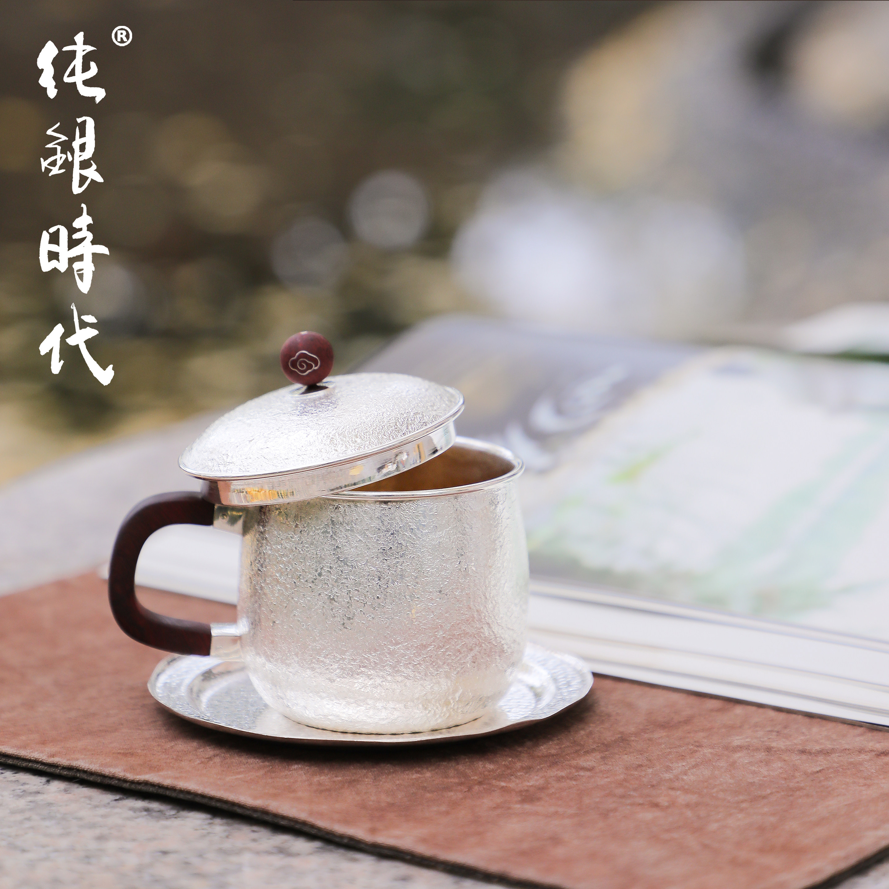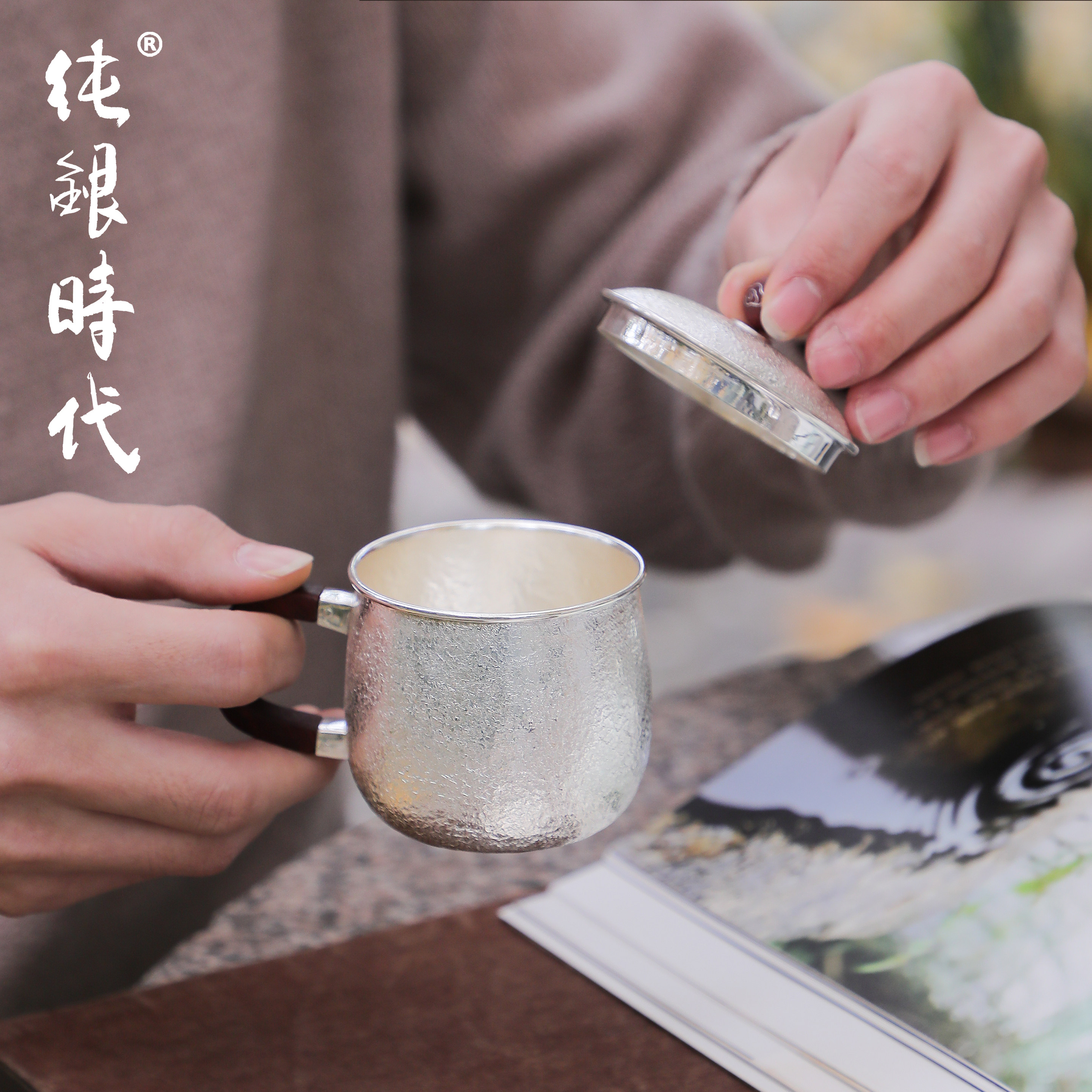 纯银时代 岩肌纹带盖马克杯纯银999手工茶杯办公室咖啡杯170ml