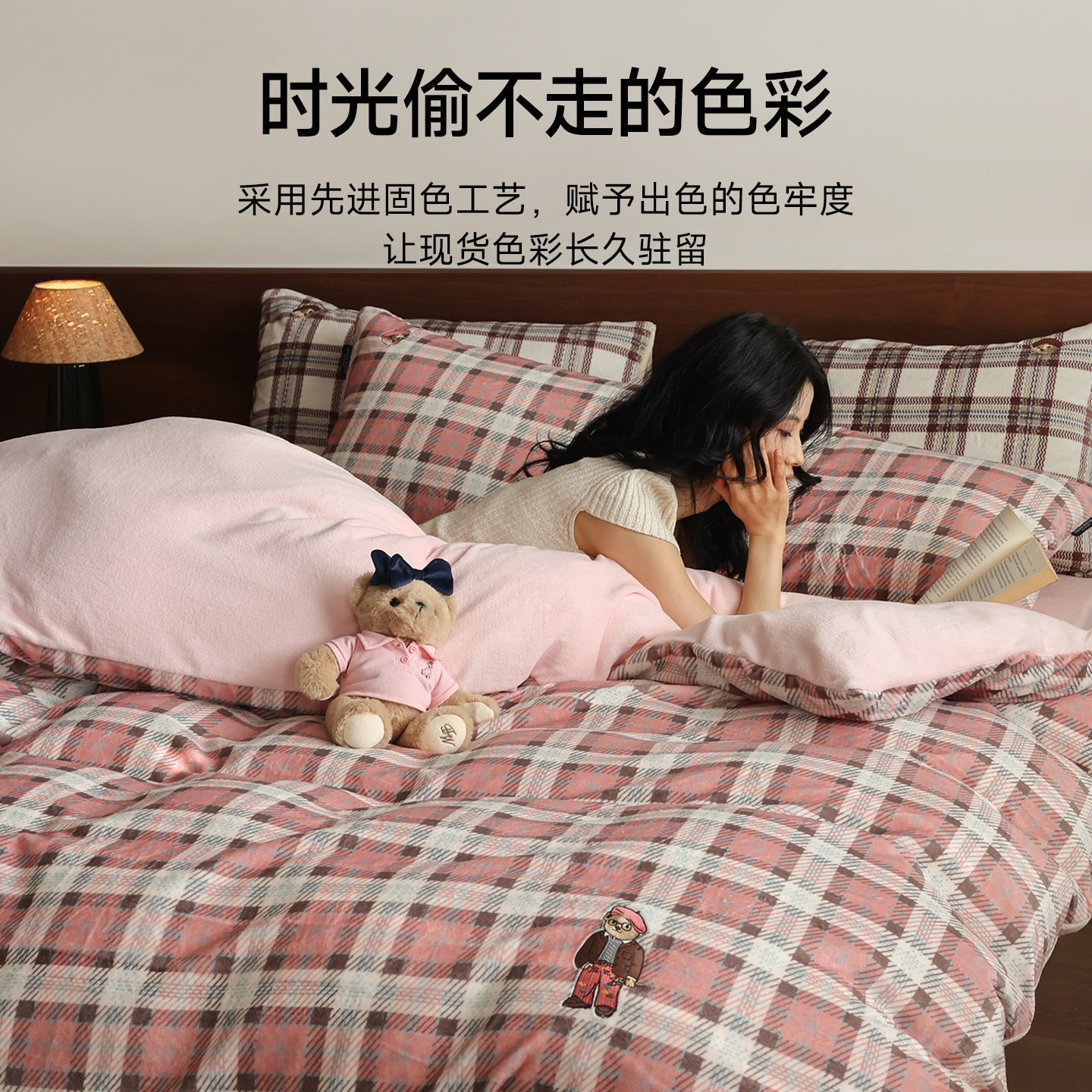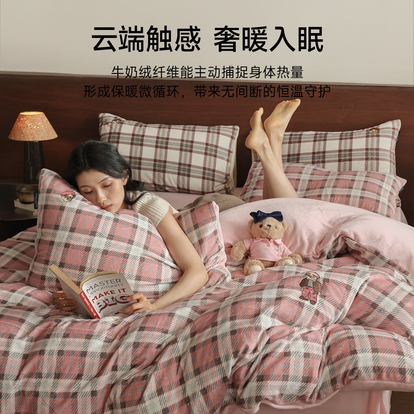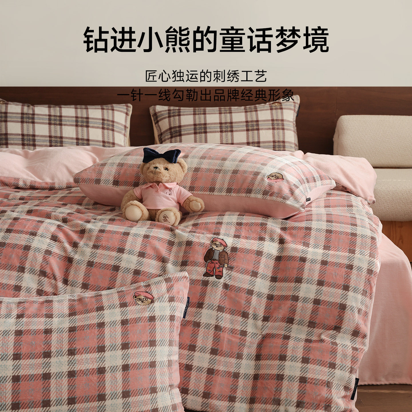 TeenieWeenie粉格纹牛奶绒四件套