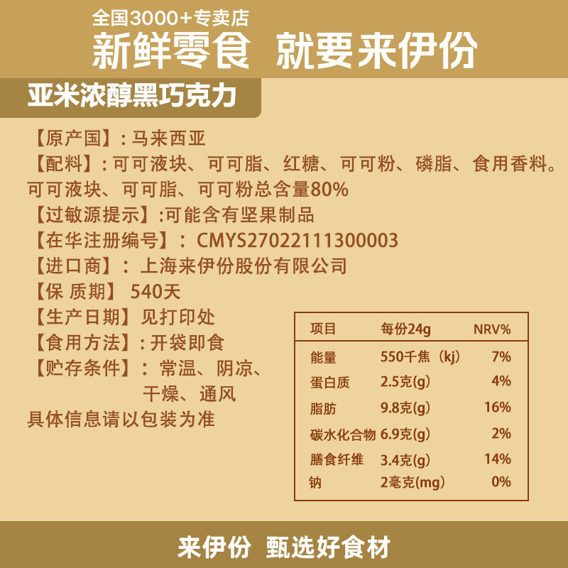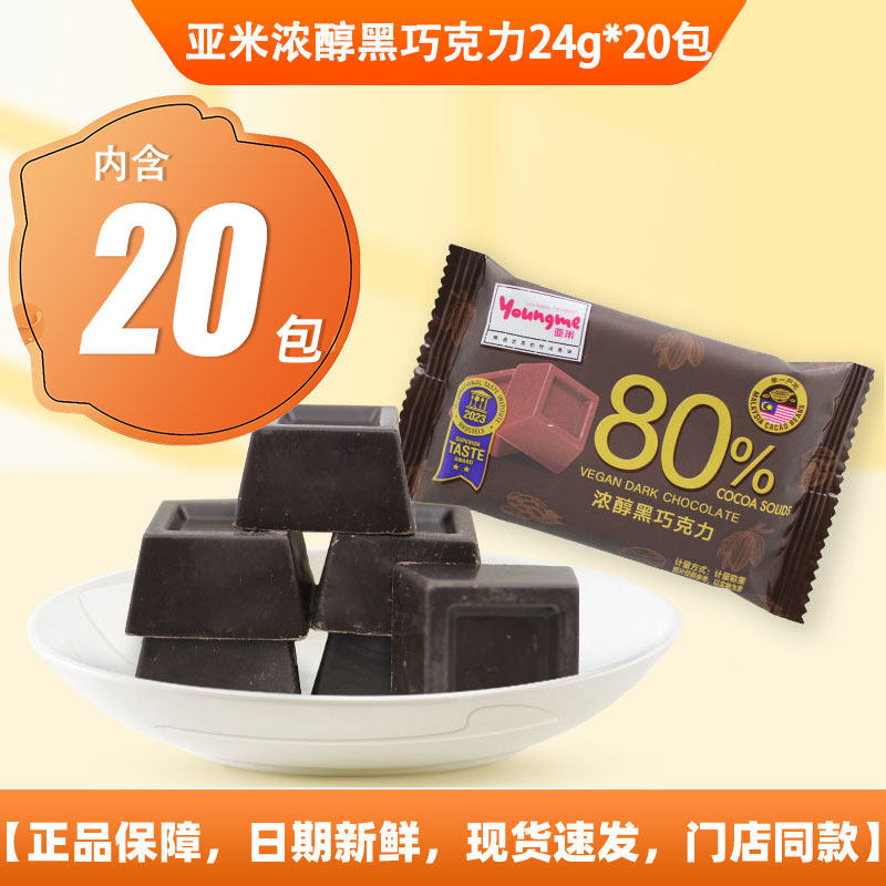 来伊份亚米浓醇黑巧克力24g*20包休闲零食糖果80%可可脂香浓进口