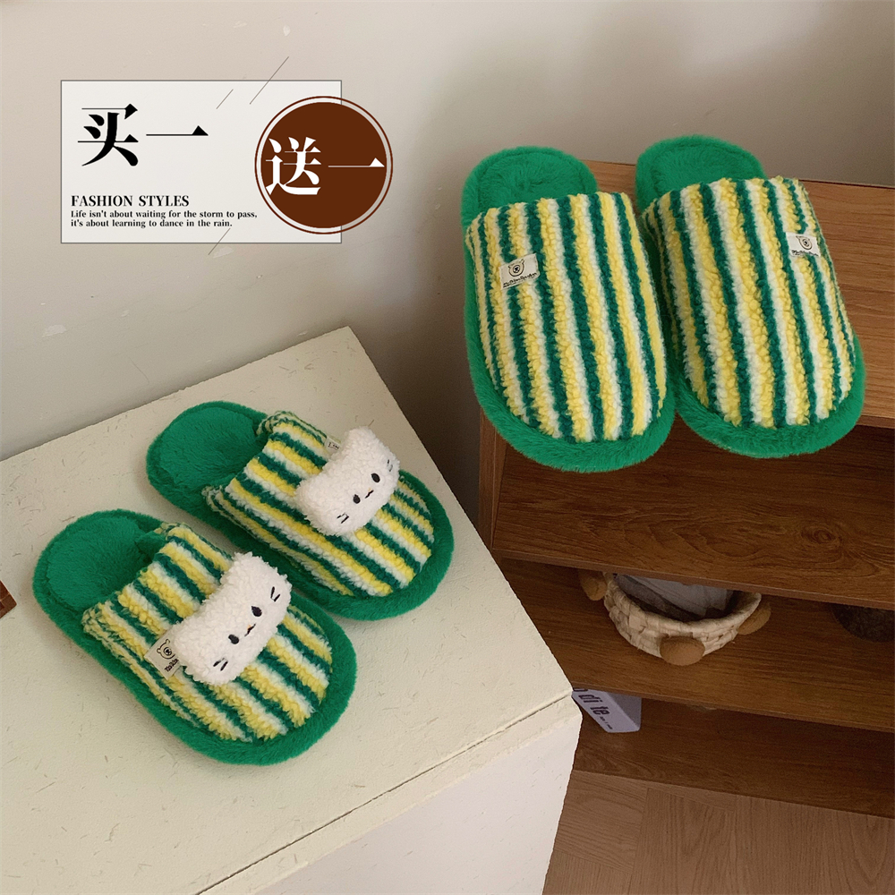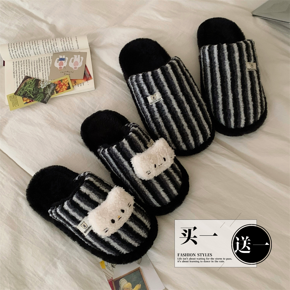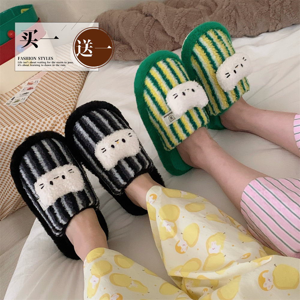 买一送一拼色秋冬毛毛鞋可爱小猫咪男女士条纹情侣平底保暖棉拖鞋