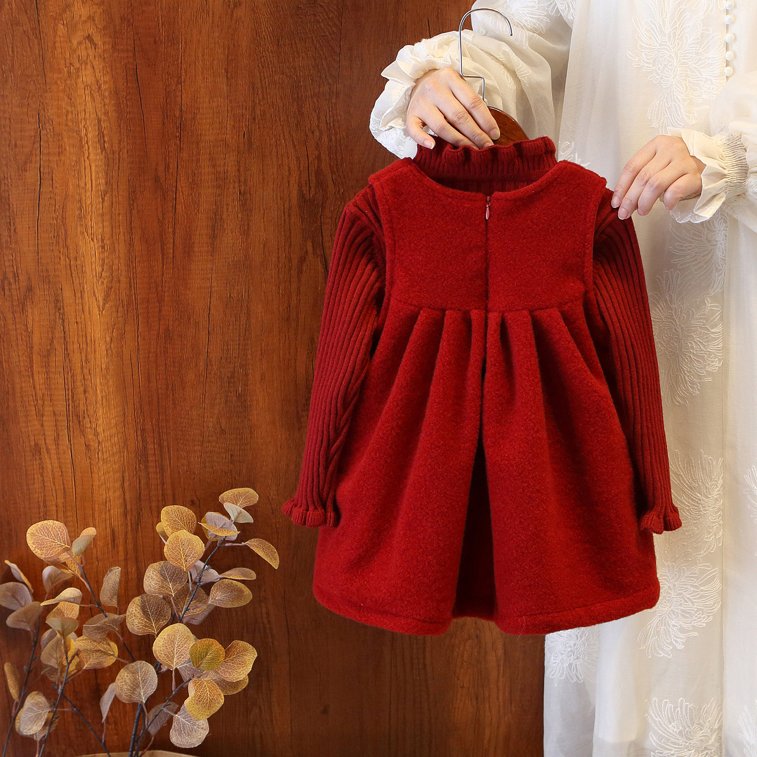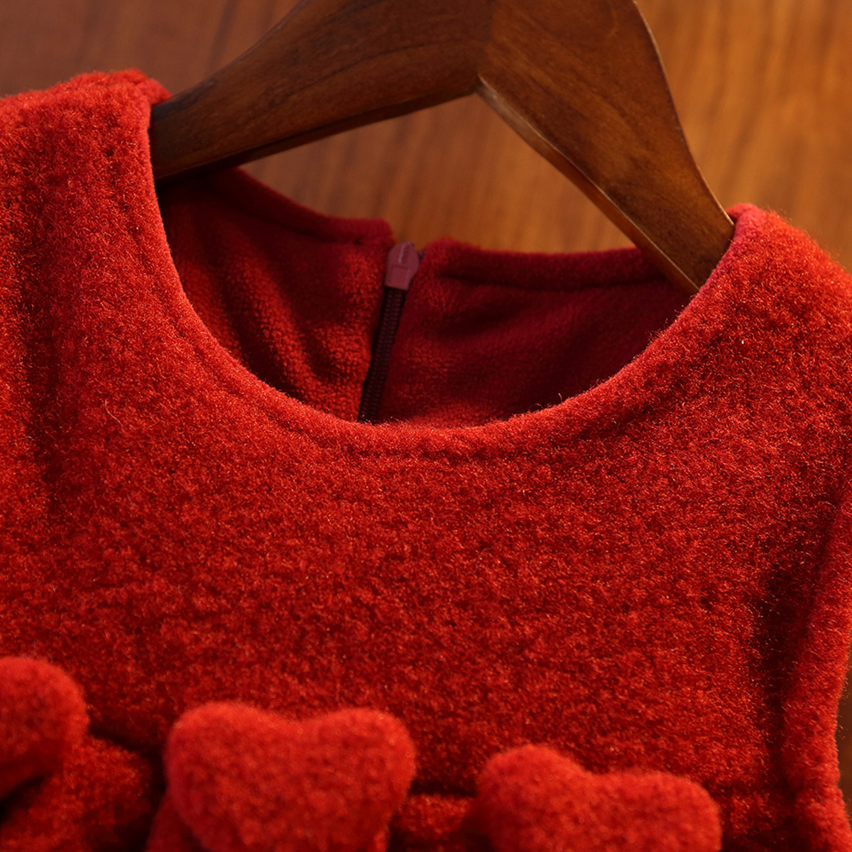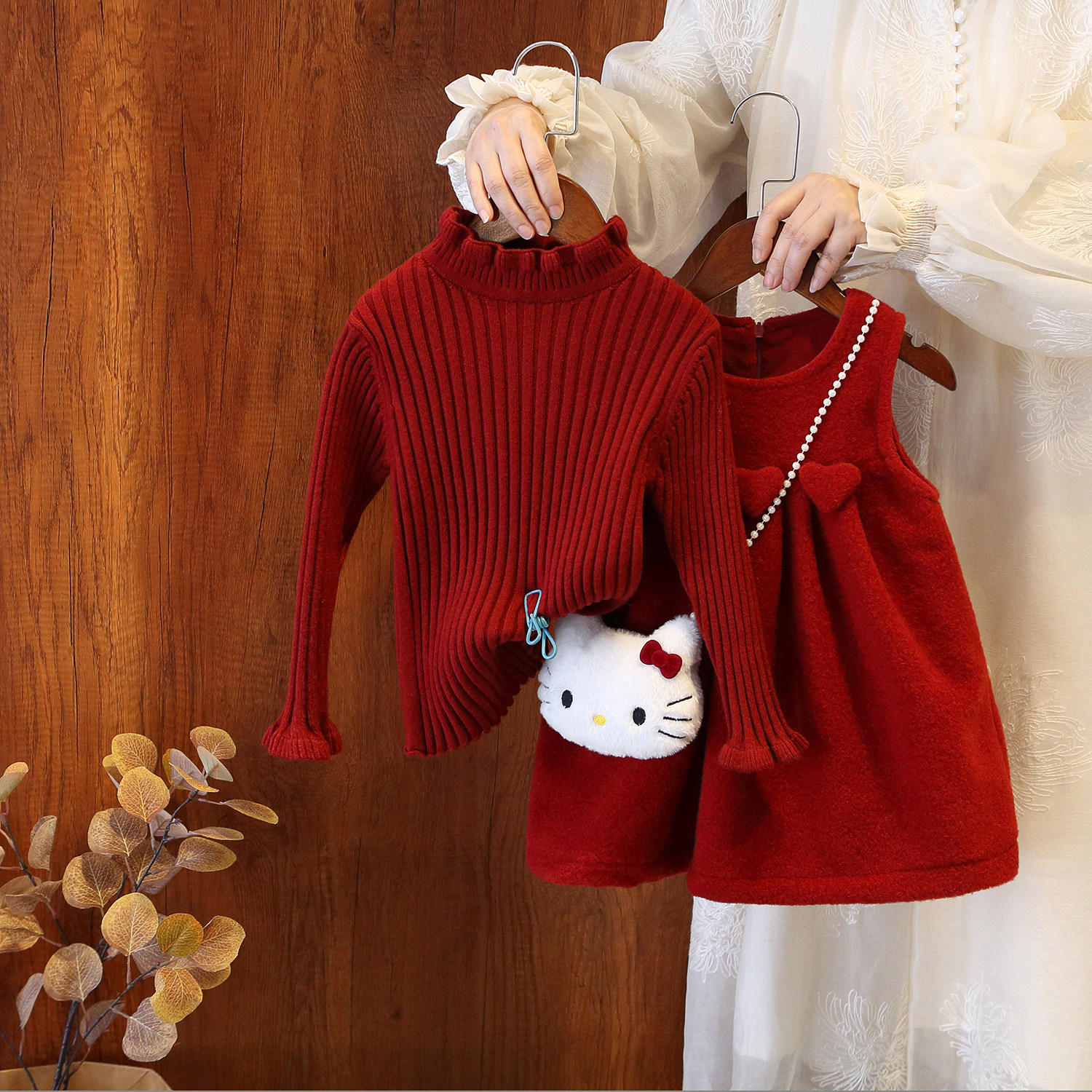 女童加绒加厚爱心连衣裙套装秋冬新款小女孩红色公主裙毛衣两件套