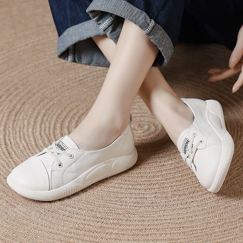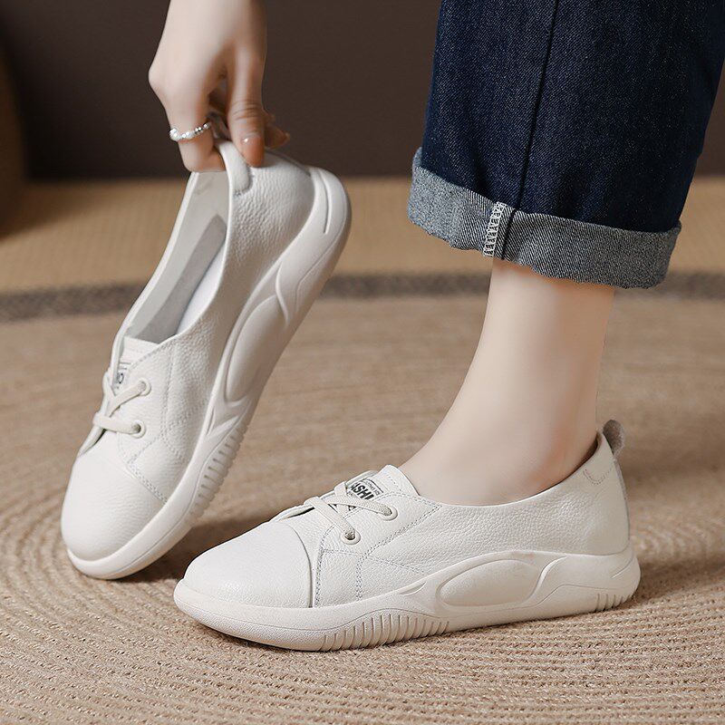 头层牛皮浅口小单鞋女洋气2024春秋新款百搭平底女士妈Z妈小白女