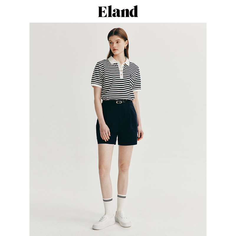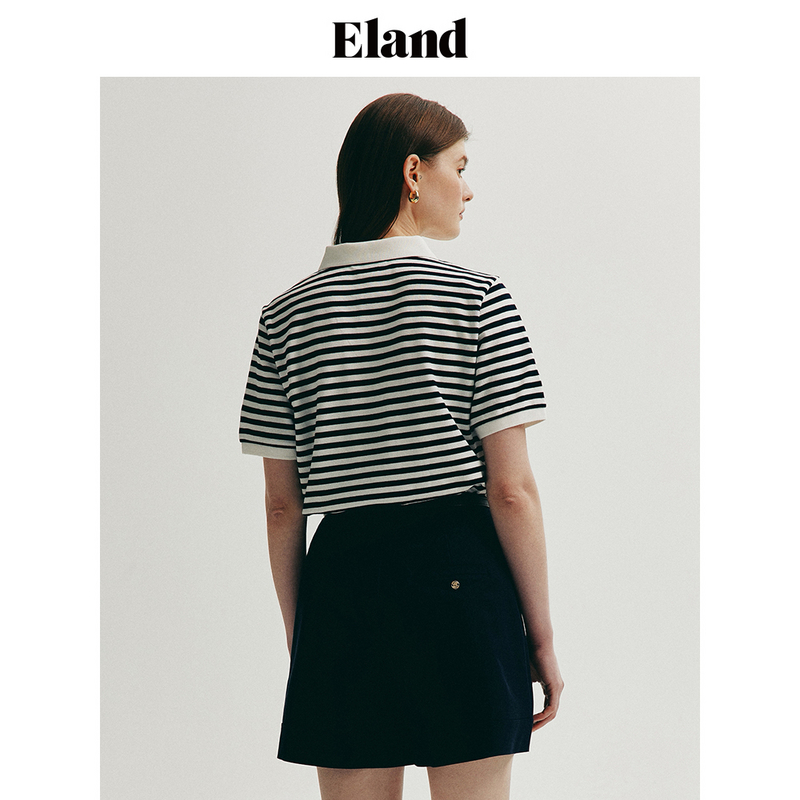 【100%棉】Eland衣恋短袖T恤女经典条纹微宽松polo衫上衣