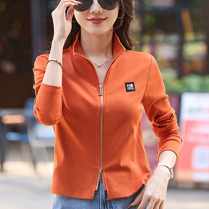 纯棉卫衣外穿女早秋新款显瘦长袖t恤拉链立领时尚运动休闲短上衣
