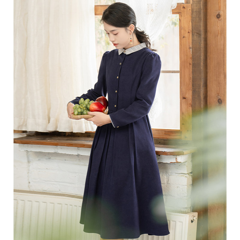 纻衣藏蓝色方领长袖连衣裙女2025秋季新款修身显瘦文艺气质中长裙