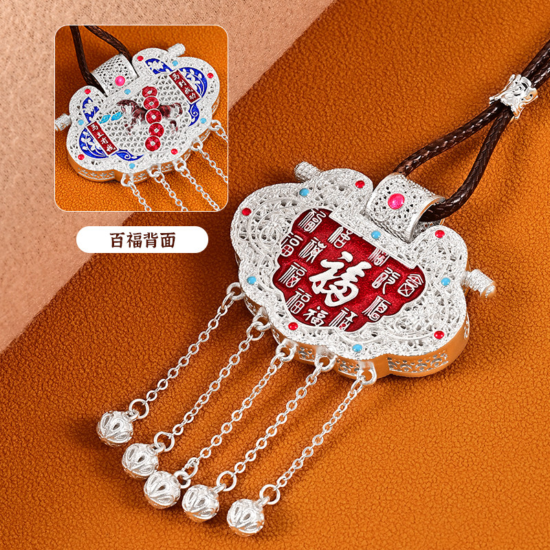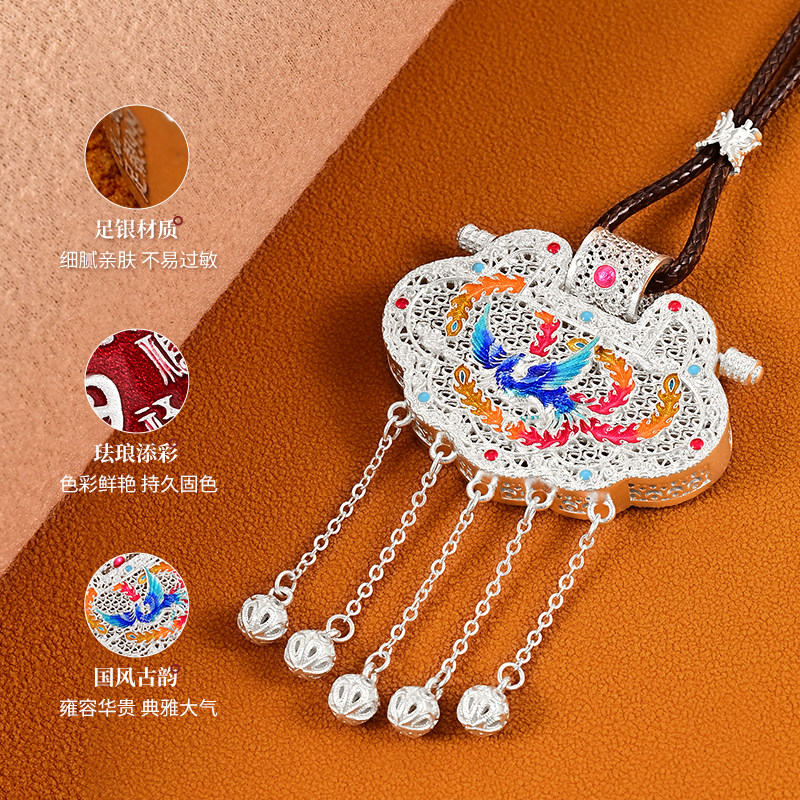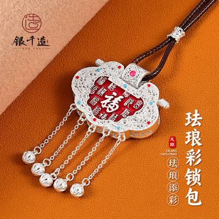 银千造 锁包足银999花丝镂空珐琅彩银吊坠长命锁女款纯银毛衣链坠