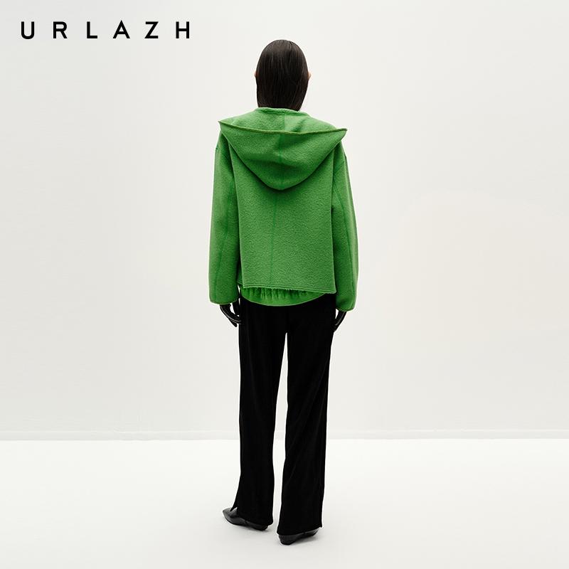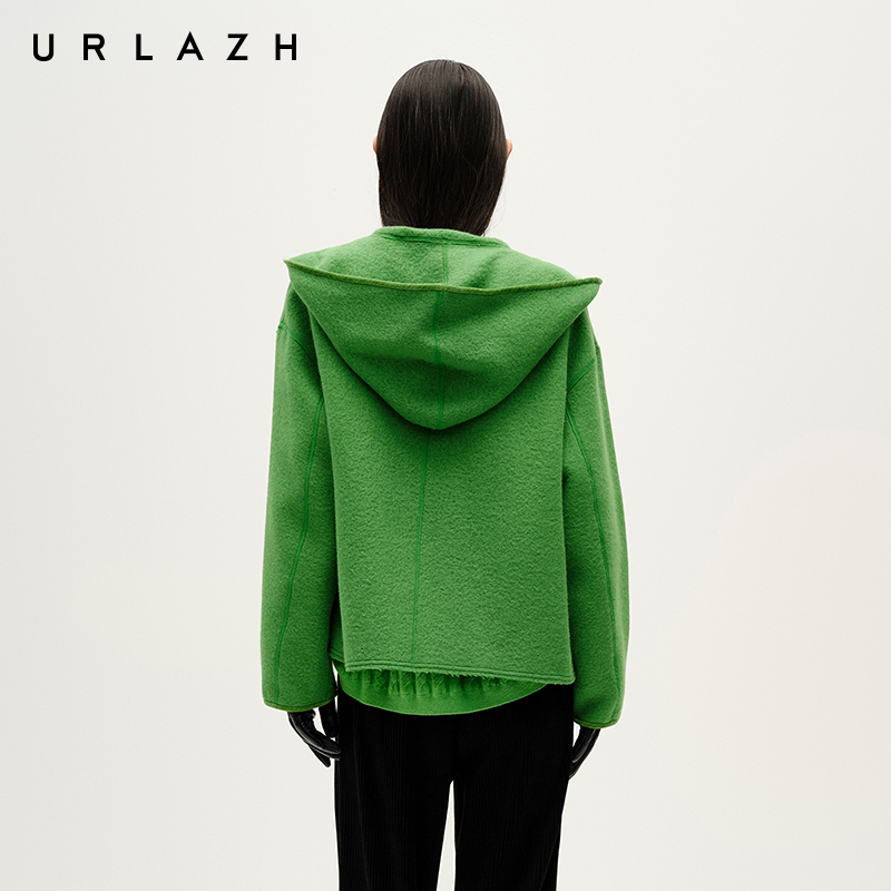 URLAZH有兰冬季新款设计感草绿色短款羊驼毛休闲连帽毛呢大衣女