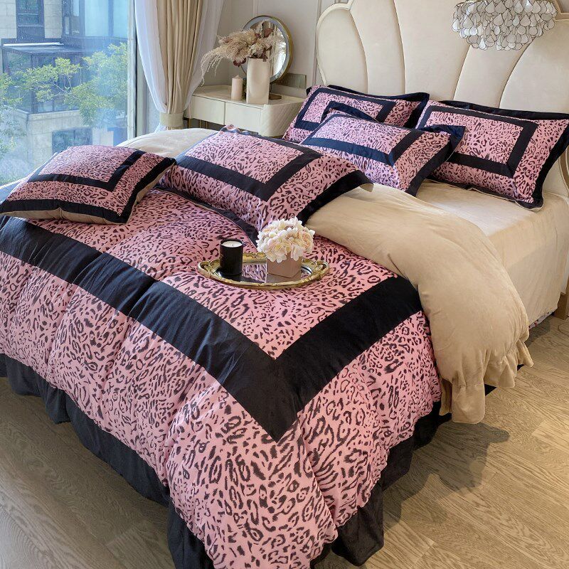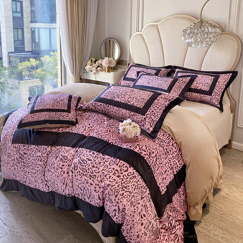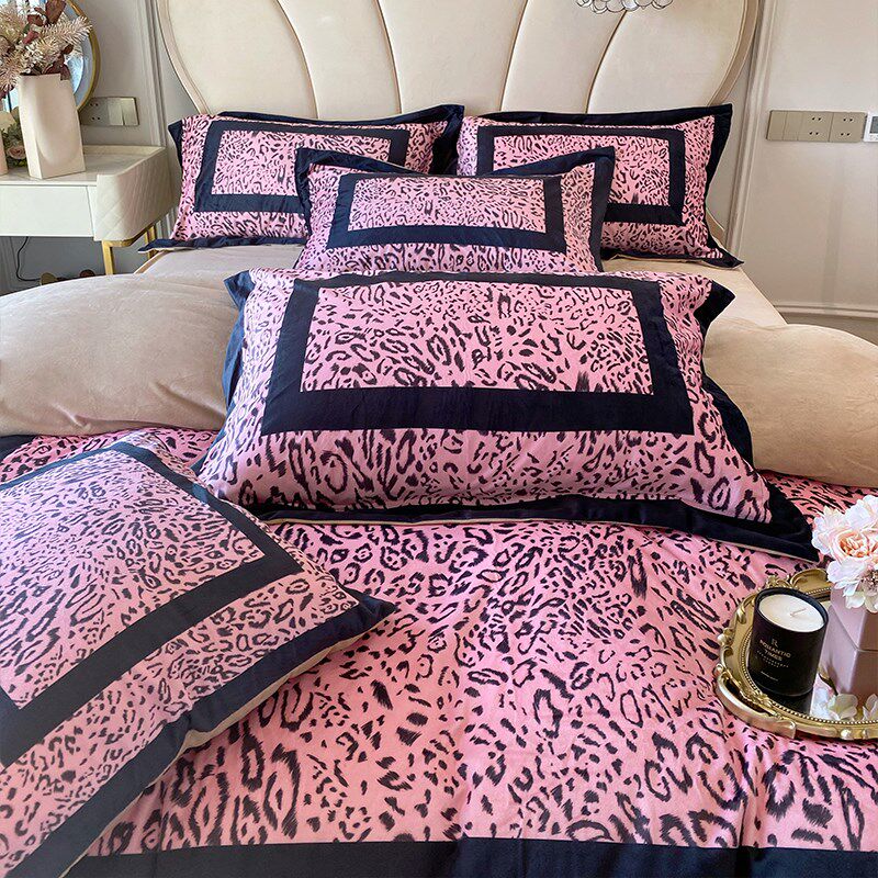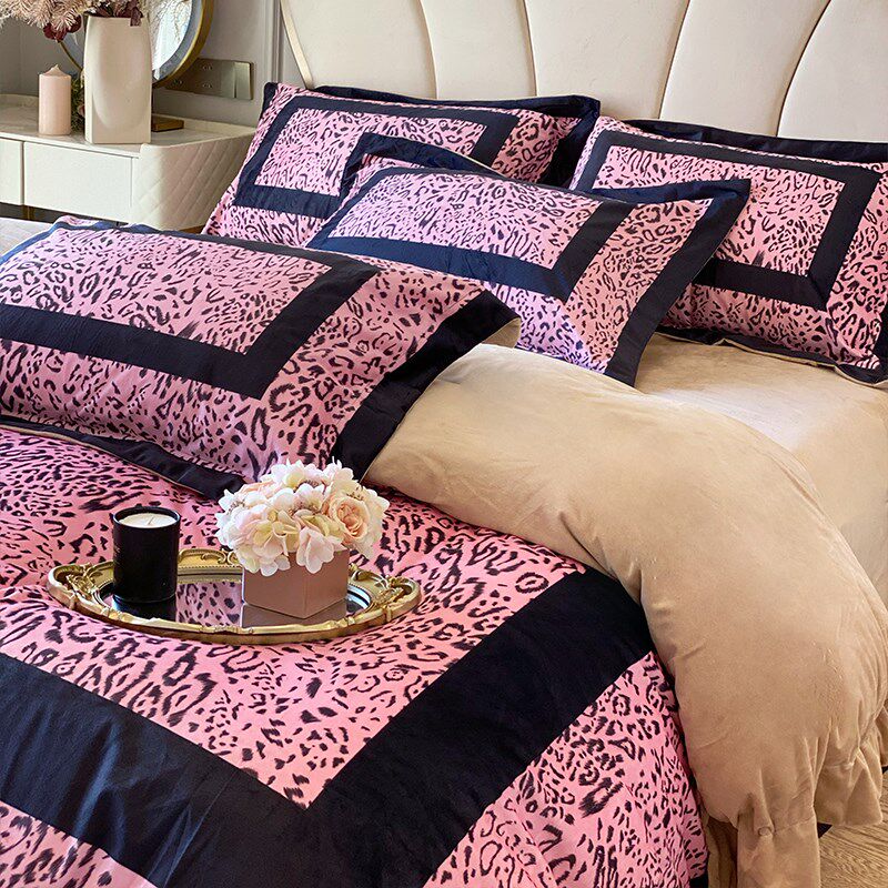 喜庆风时尚豹纹印花全棉长绒w棉四件套高级感轻奢被套纯棉床单床