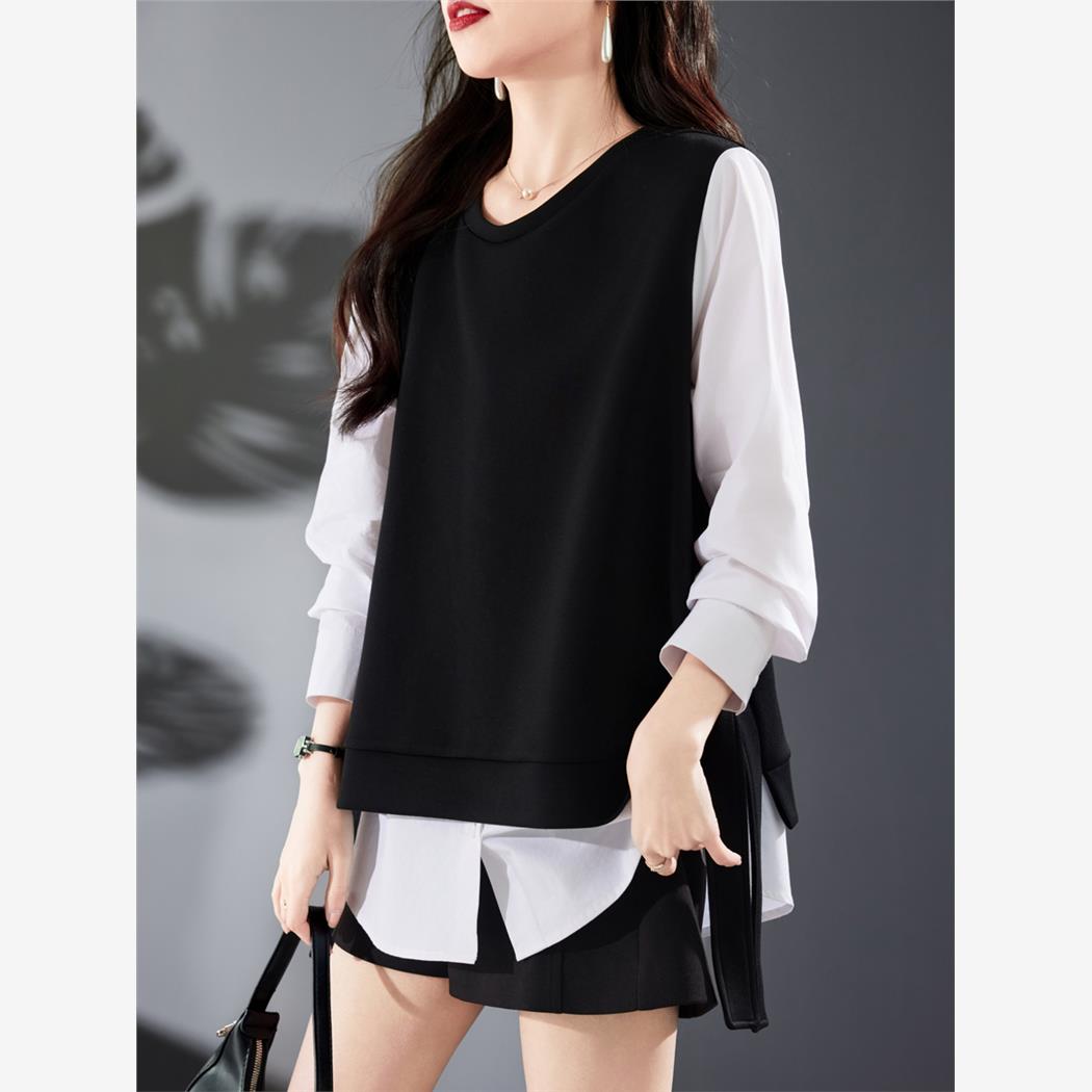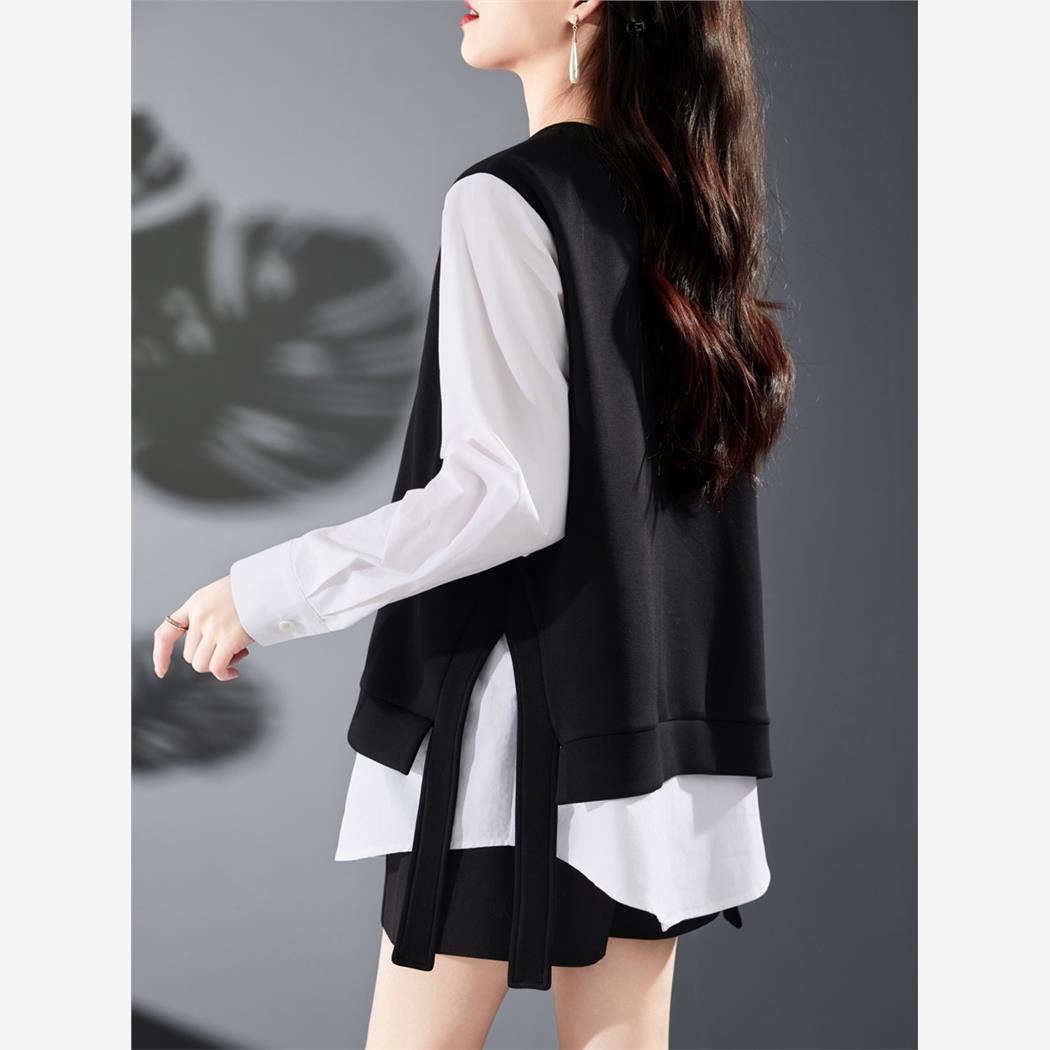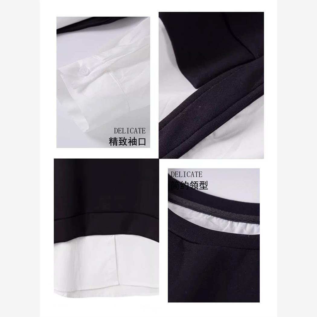 2025秋季新款减龄衬衫开衩黑白拼接运动衫宽松休闲假两件套式女士