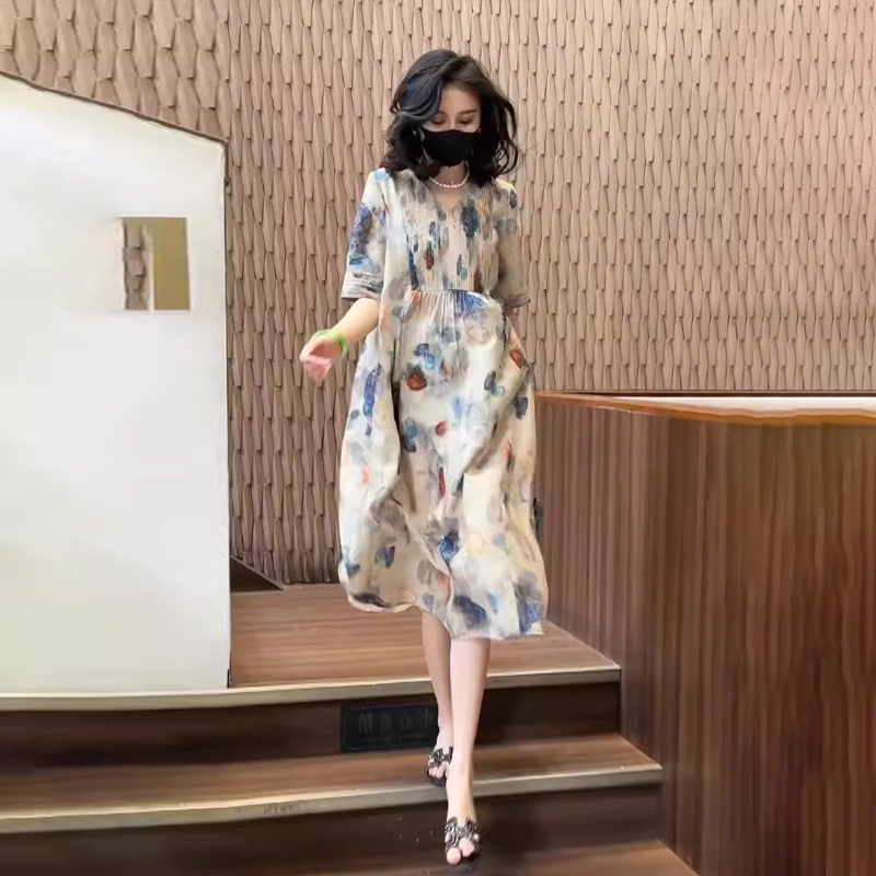 素雅订制女装原创品牌25时尚高级感碎花气质连衣裙棉麻苎麻长裙子