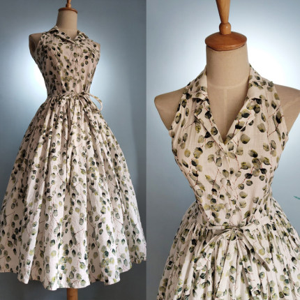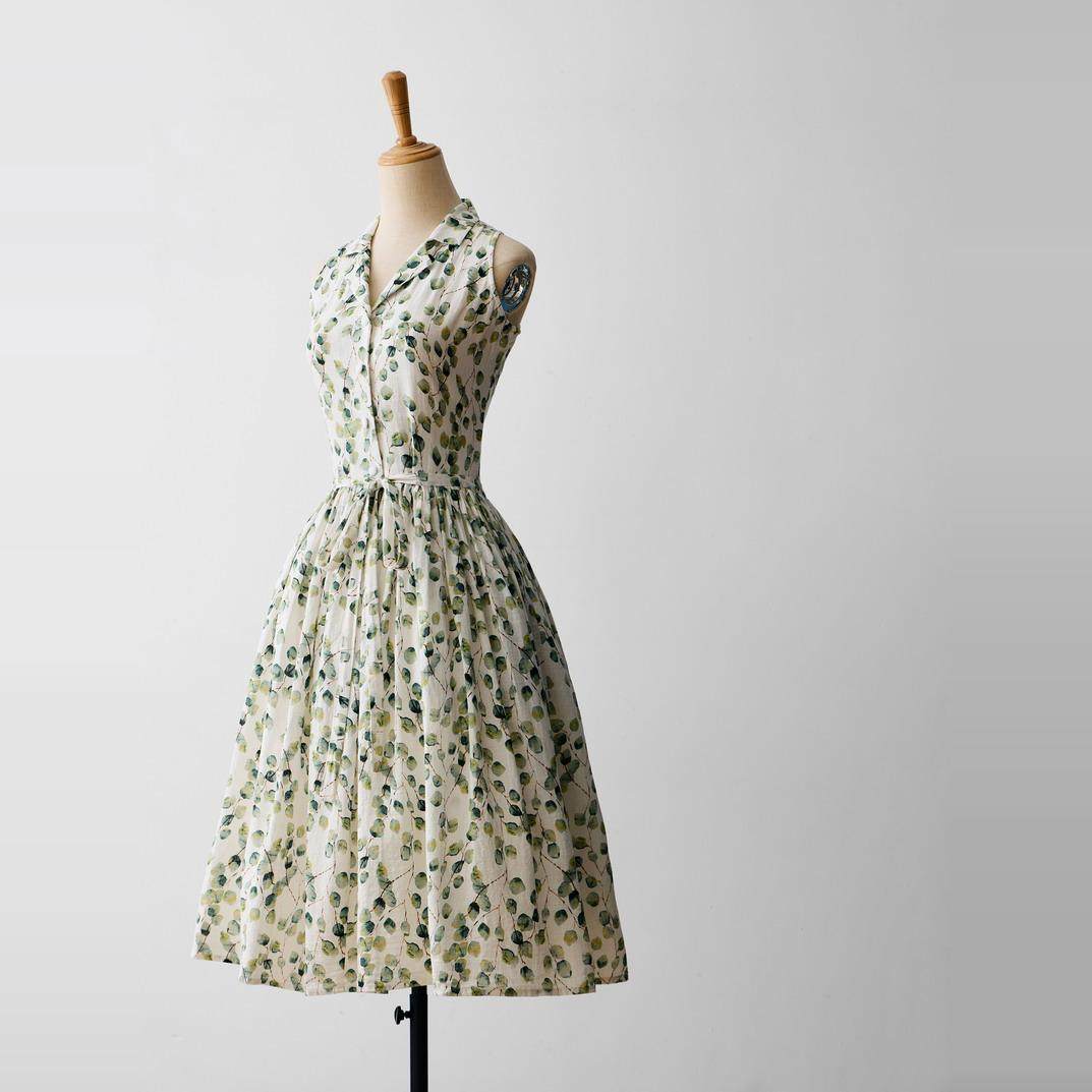 有口袋全棉挖肩西装领收腰带360度大摆伞裙碎花连衣裙全棉