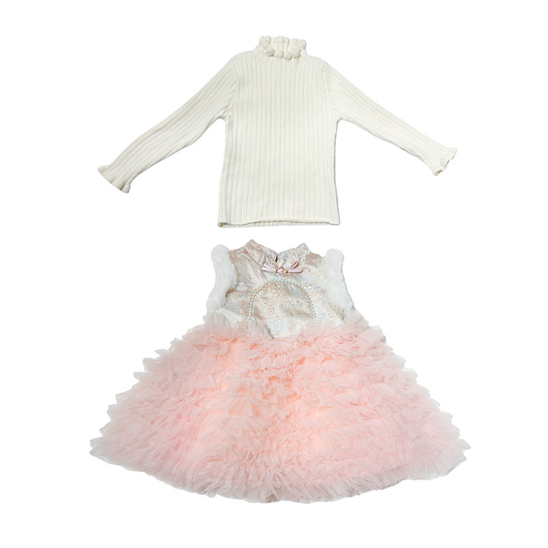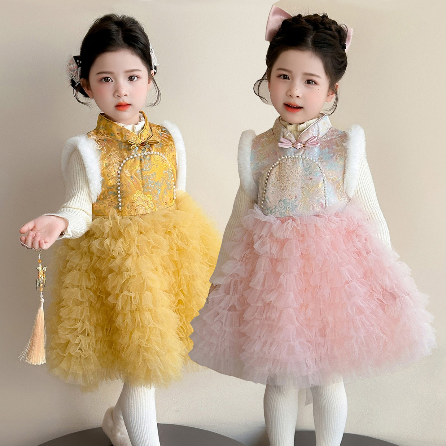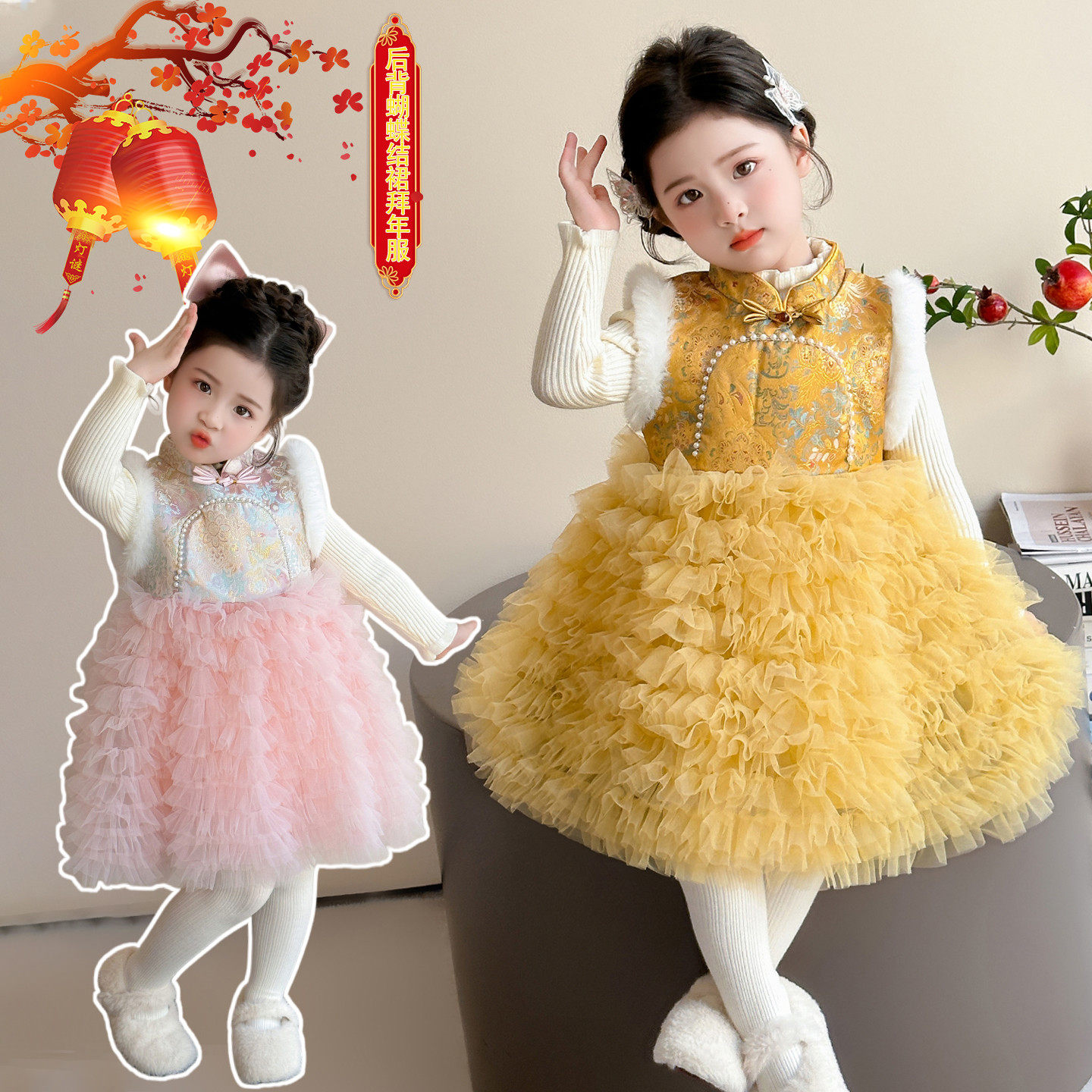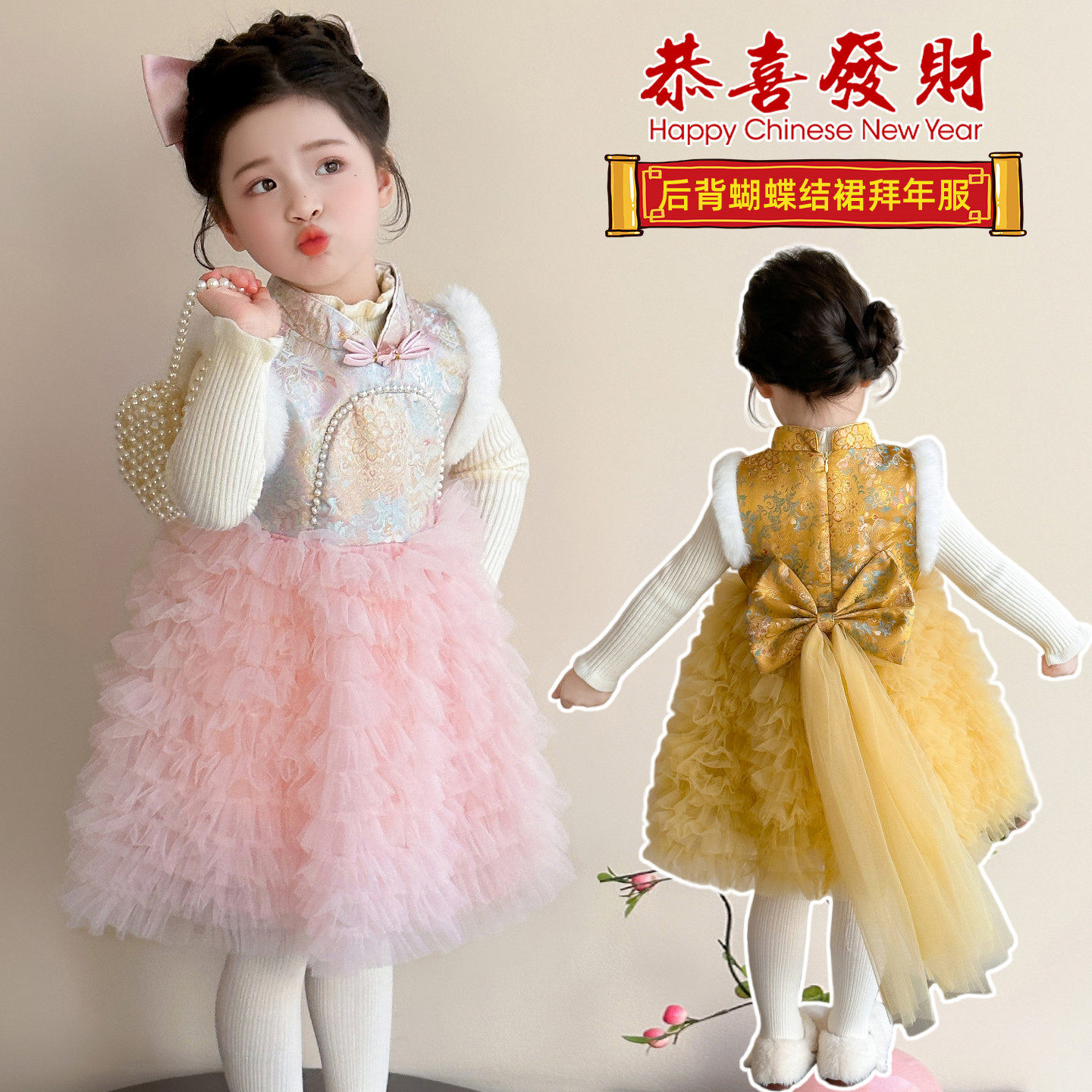 唐装女童加绒连衣裙秋冬季宝宝蛋糕裙中国风儿童汉服拜年服公主裙