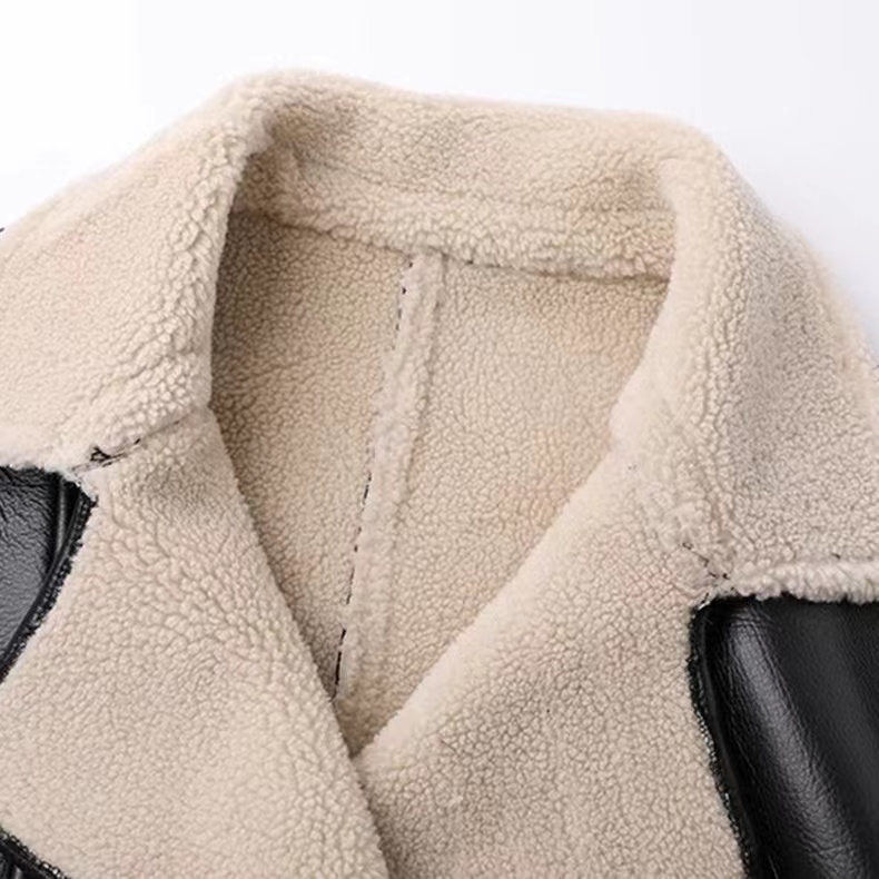 17970复古双排扣机车PU皮衣女小香风西装领羊羔绒皮毛一体短外套