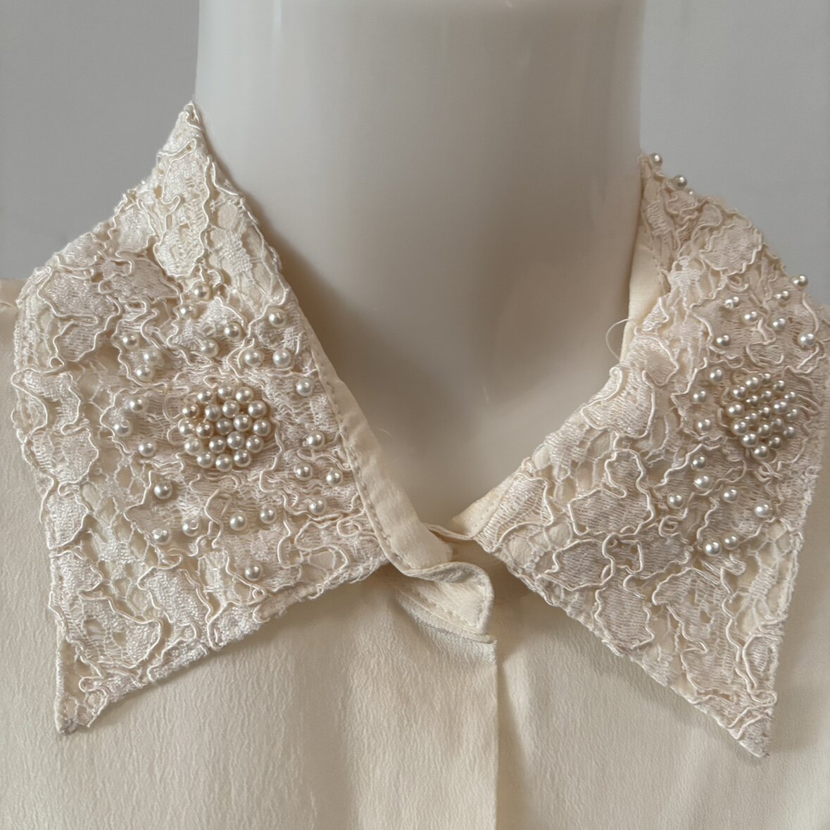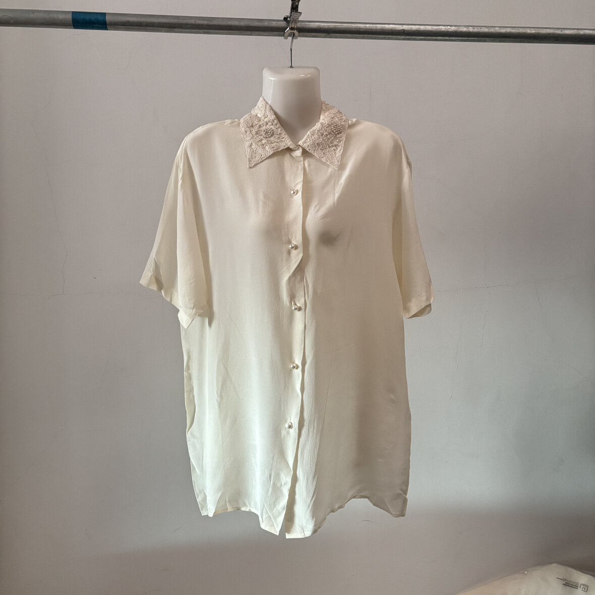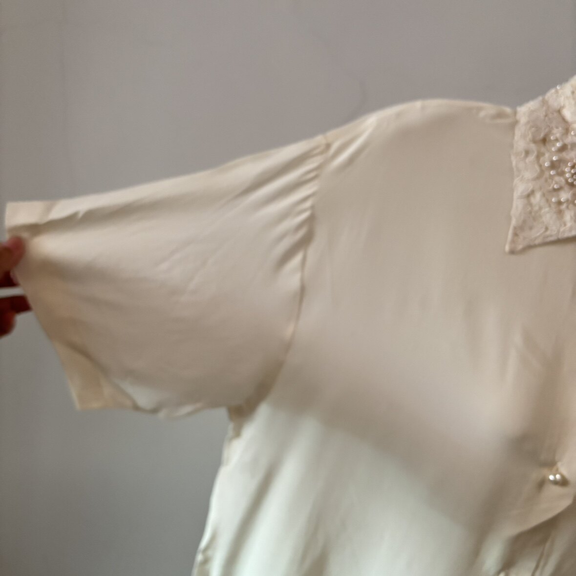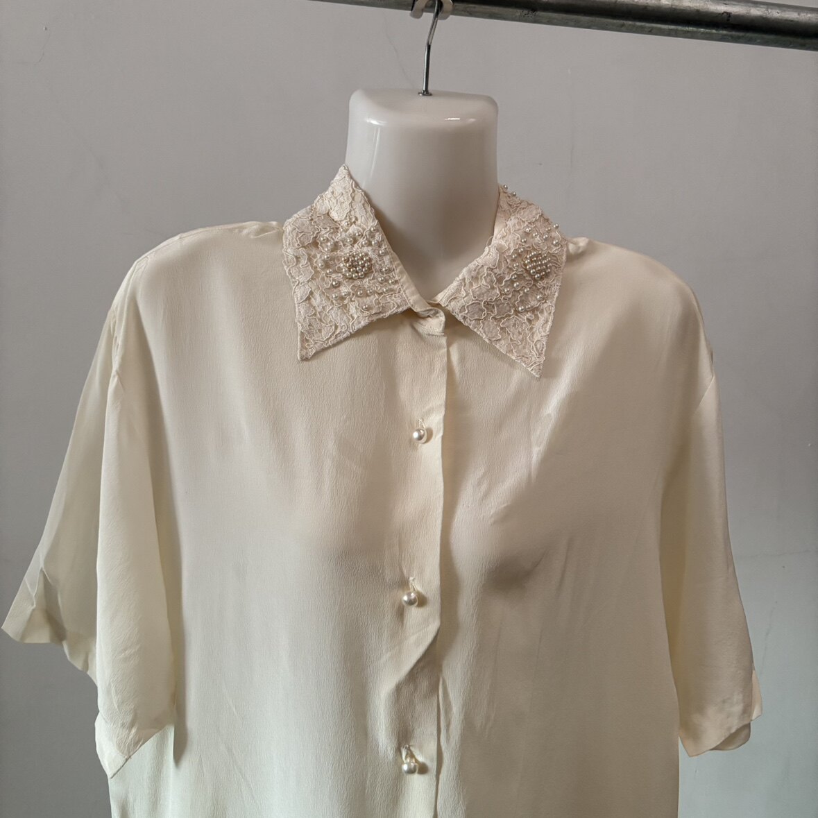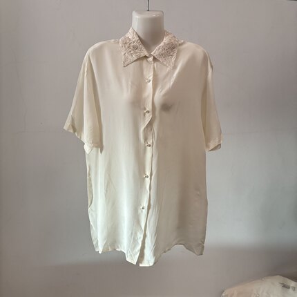 真丝双绉钉珠蕾丝花边领衬衫短袖