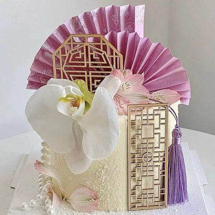 彩虹烘焙馆古风潮蛋糕装饰木质栅栏屏风插件紫色扇子母亲节蝴蝶兰