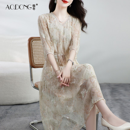 高端真丝连衣裙女刺绣甜美桑蚕丝收腰显瘦妈妈五分袖裙子仙气夏季