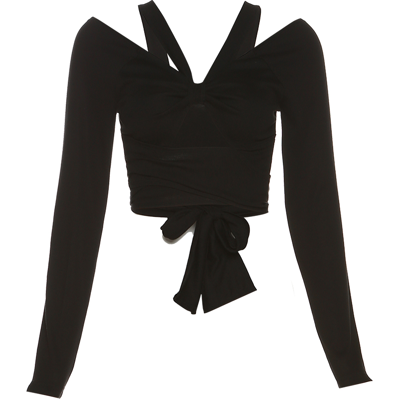 KLIOU Lisa同款辣妹风黑色镂空系带长袖T恤女设计感显瘦高腰上衣