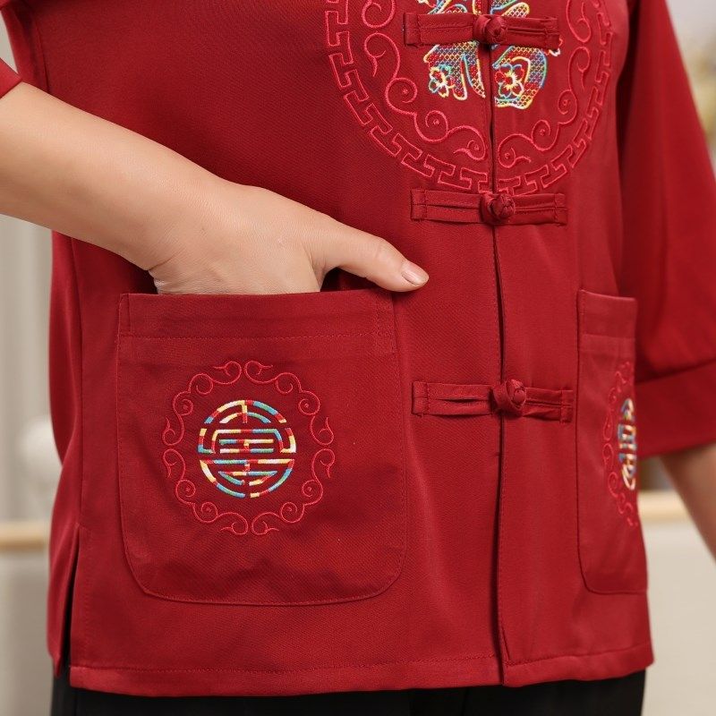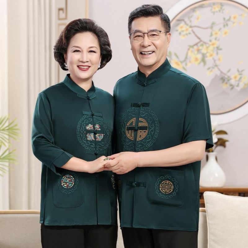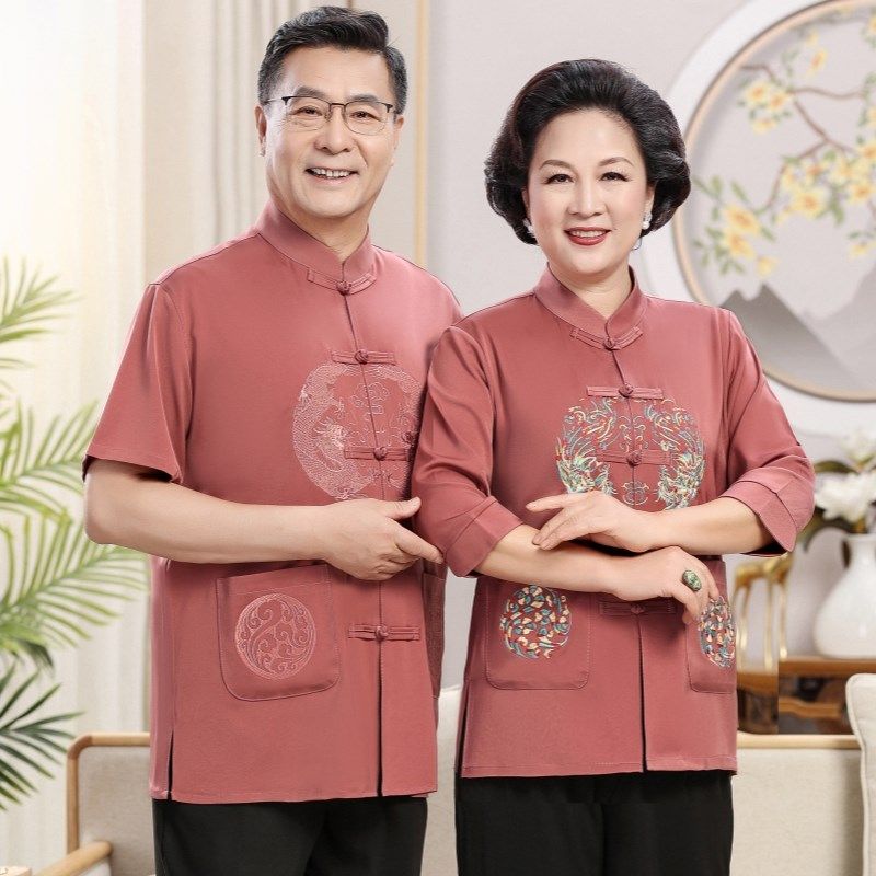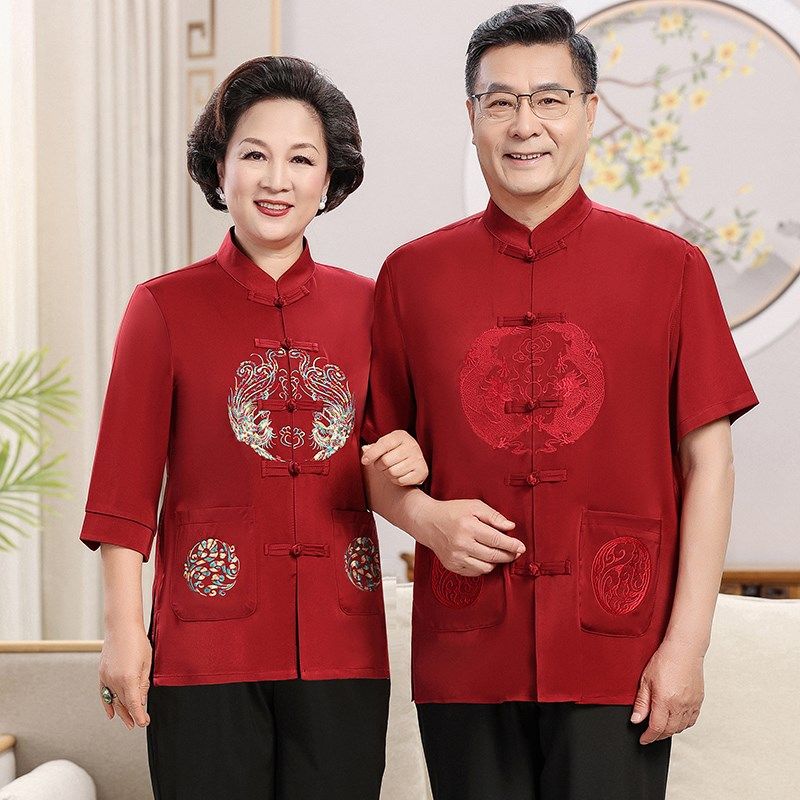 中老年夏装短袖男女情侣唐装老人真丝套装爸爸妈妈上衣喜庆婚礼服