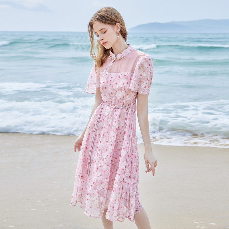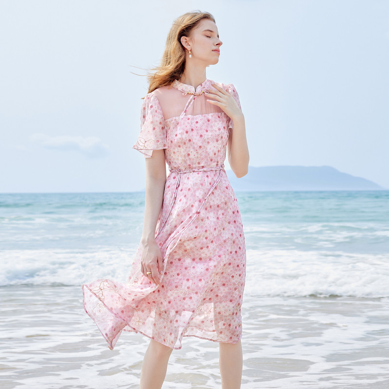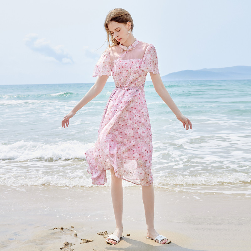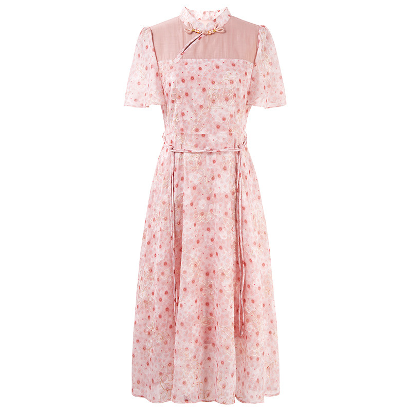 秋水伊人新中式碎花雪纺连衣裙2025夏新款女复古收腰改良旗袍长裙