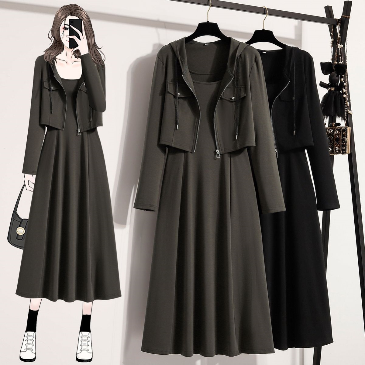 2025秋大码长袖开衫外套吊带背心连衣裙女套装新款百搭显瘦两件套