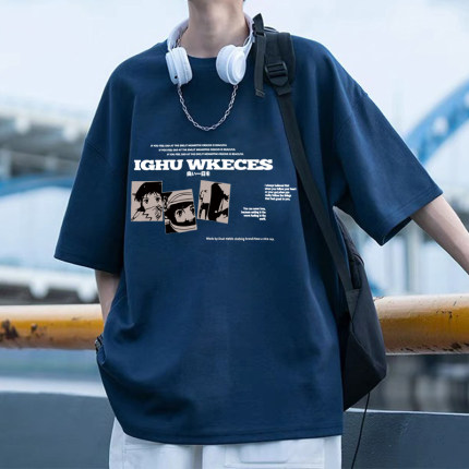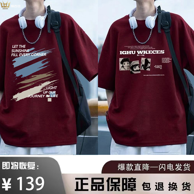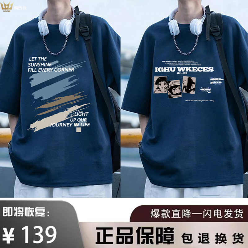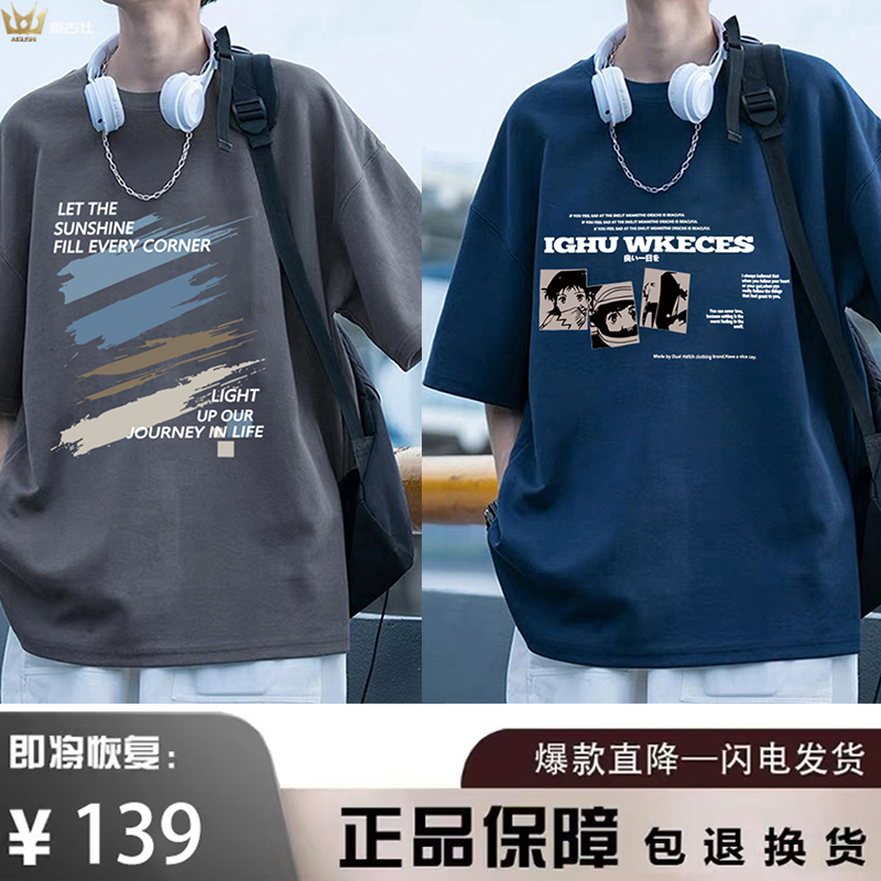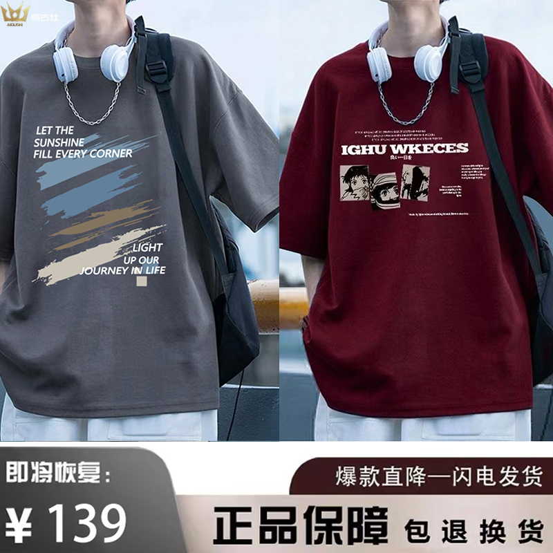 夏季新款重磅T恤男两件套纯棉短袖水彩涂鸦印花宽松潮牌日系体恤