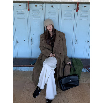 Halo Luu 棕色人字纹羊毛西装大衣女秋冬复古高级感长款毛呢外套