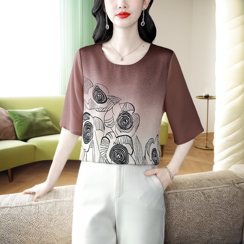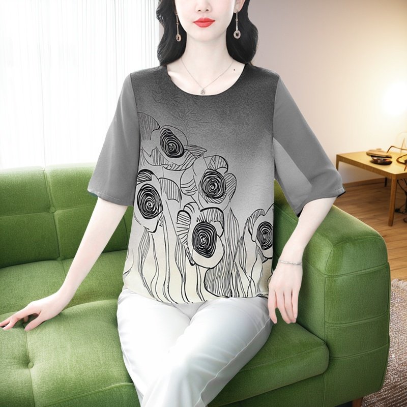 中袖雪纺衫女夏季新款时尚印花洋气妈妈上衣大码宽松显瘦薄款小衫