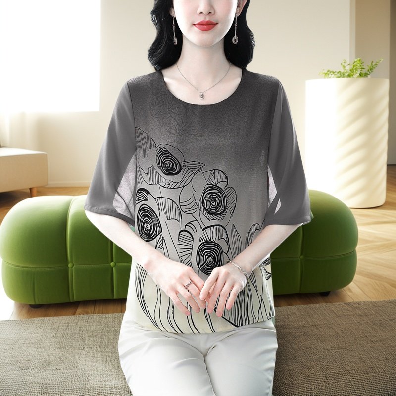 瑶蝶夏季新款中袖妈妈上衣雪纺衫