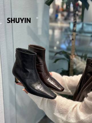 欧货真皮女靴2025新款尖头粗跟短靴女时尚百搭时装靴高跟靴