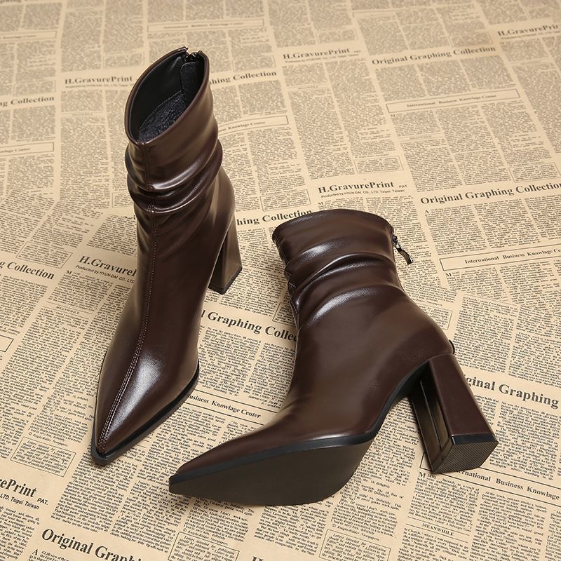 羊皮版巨好看时尚秋季咖色尖头短靴女2025秋冬新款气质法式高跟鞋