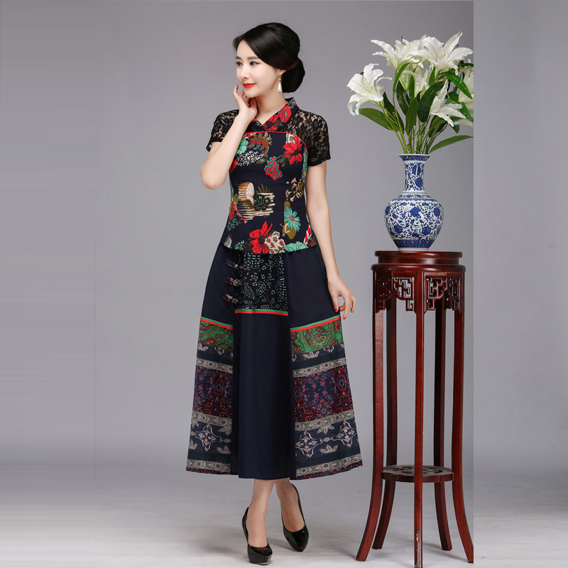 民族风套装女夏两件套改良旗袍中年上衣棉麻复古唐装连衣裙妈妈装