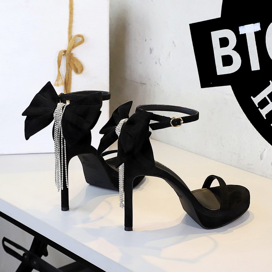 欧美豹纹一字带高跟鞋女细跟露趾防水台性感水钻链蝴蝶结宴会凉鞋