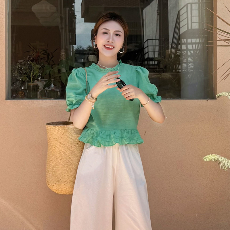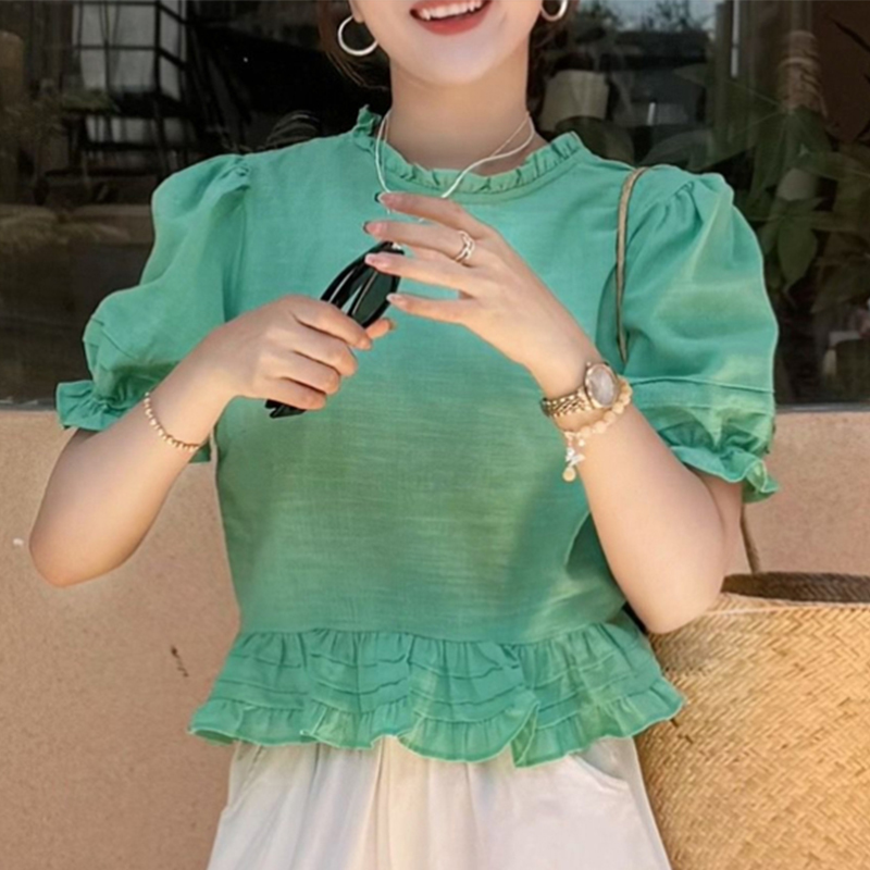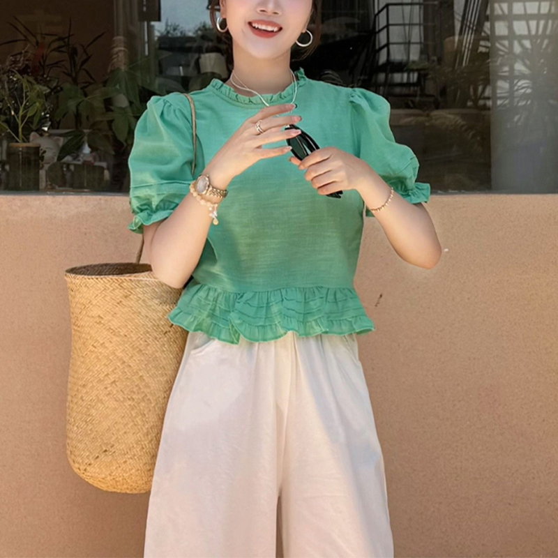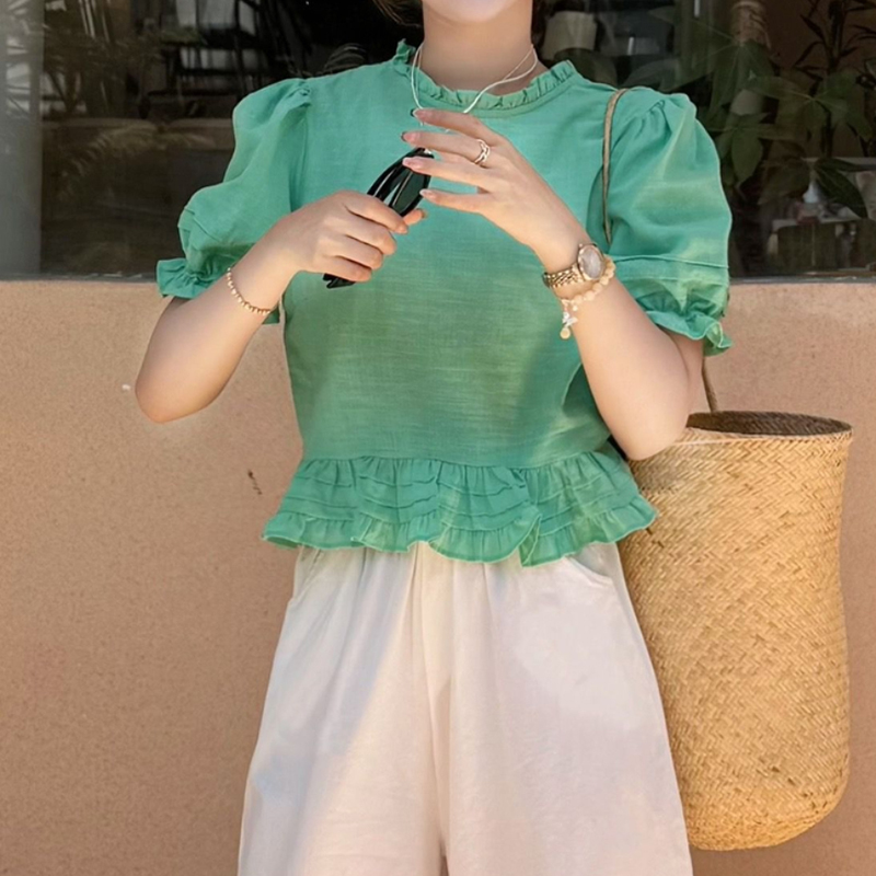 绿色泡泡袖苎麻上衣女夏季