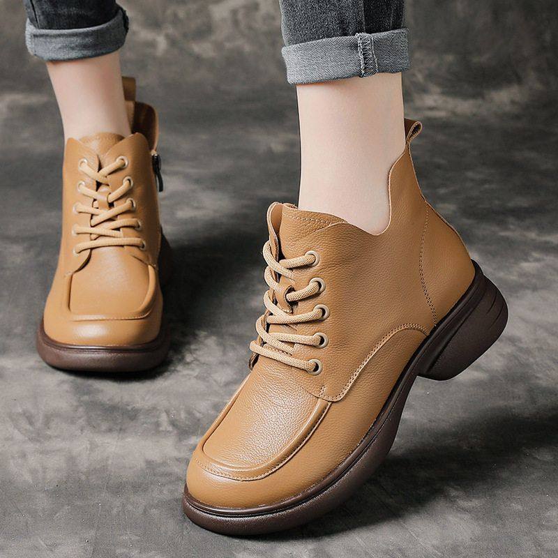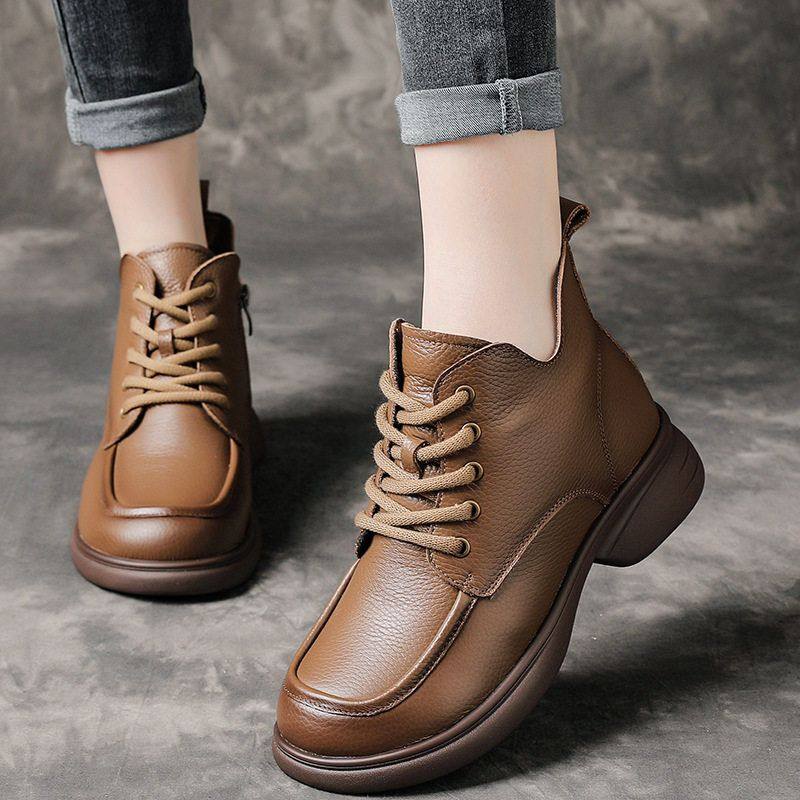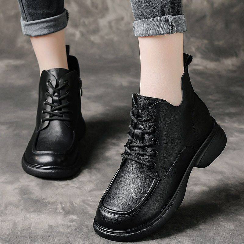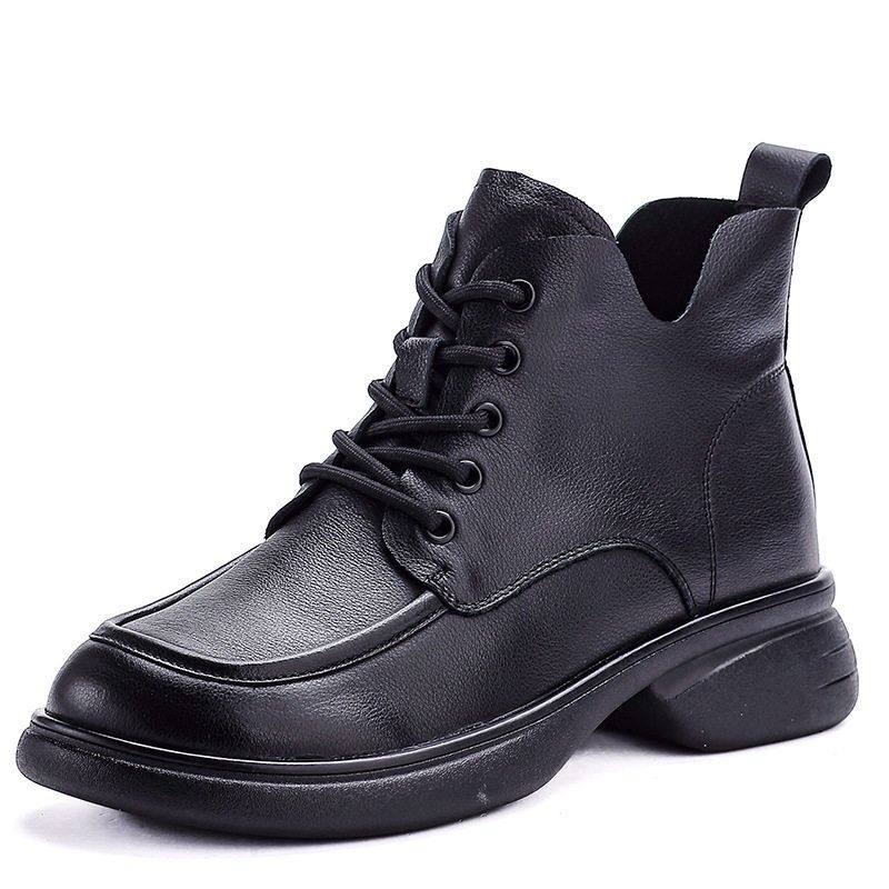 纯牛皮厚底春秋薄款单靴加绒马丁靴圆头系带软底靴子女休闲妈妈靴