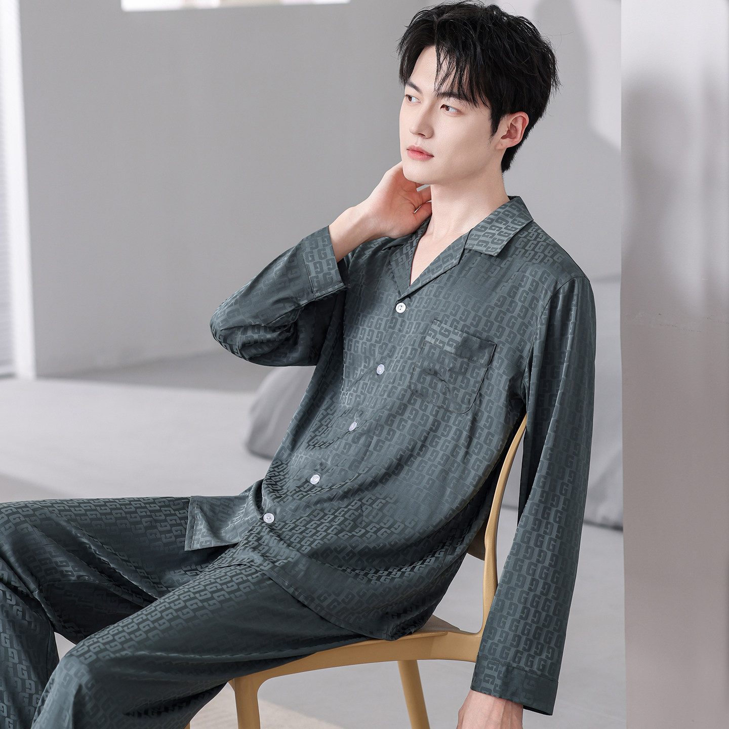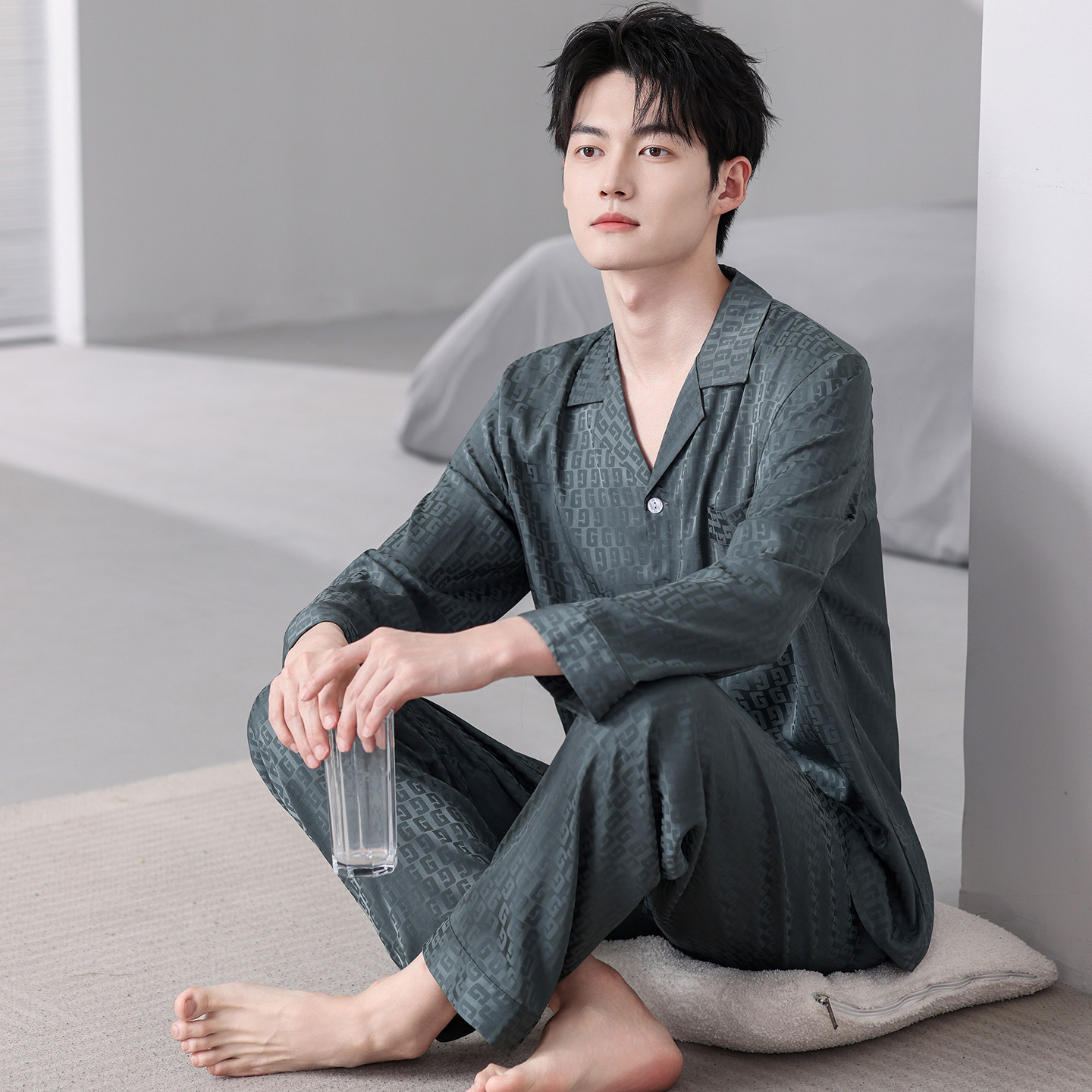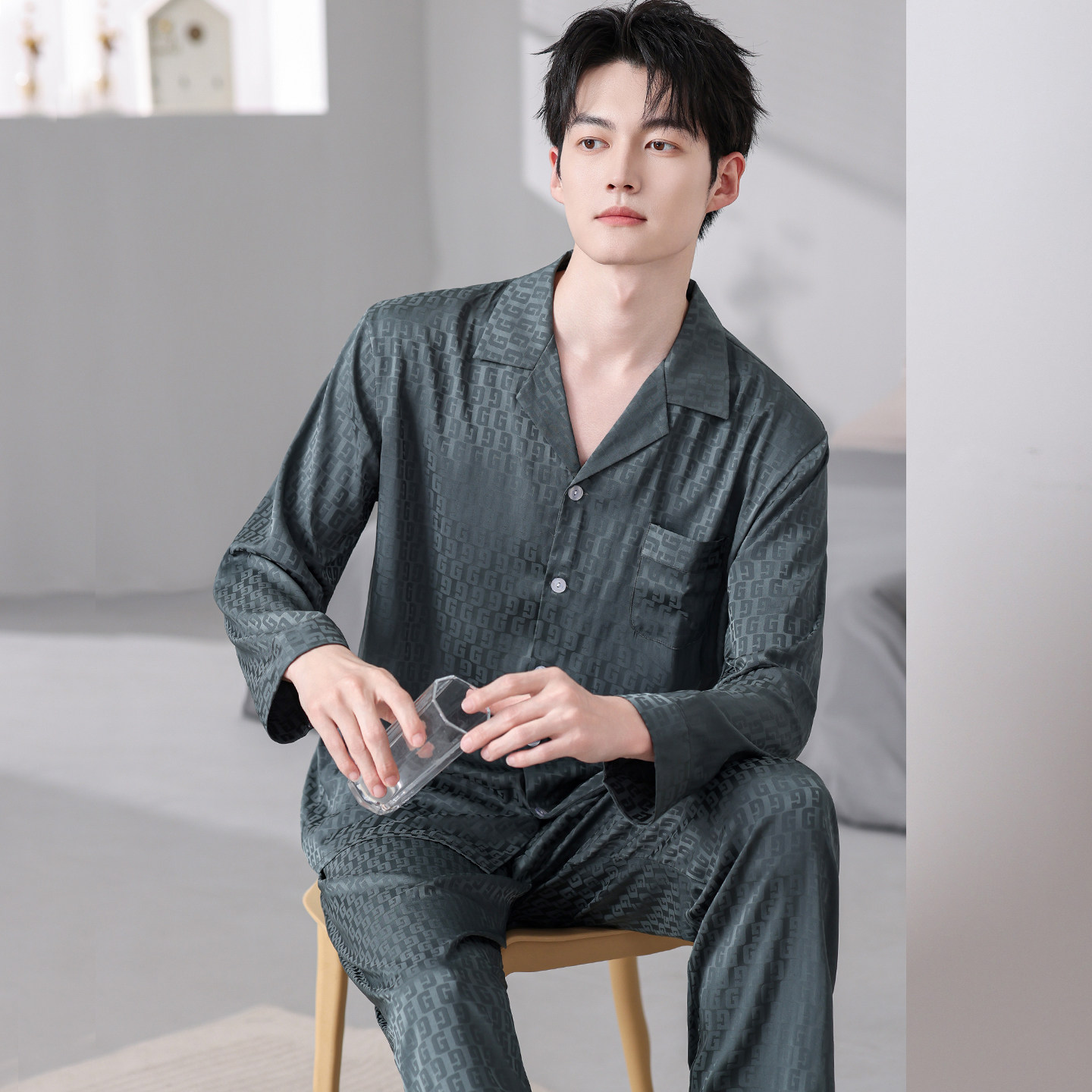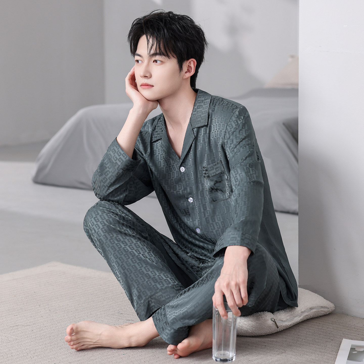 开衫男士冰丝长袖长裤睡衣套装
