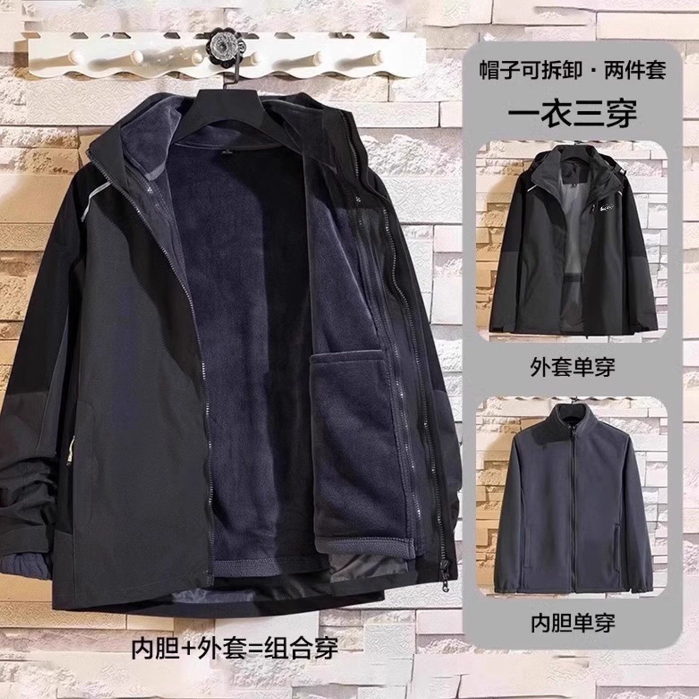 耐克顿户外工装冲锋衣男士秋冬季撞色连帽夹克潮牌三合一防风外套